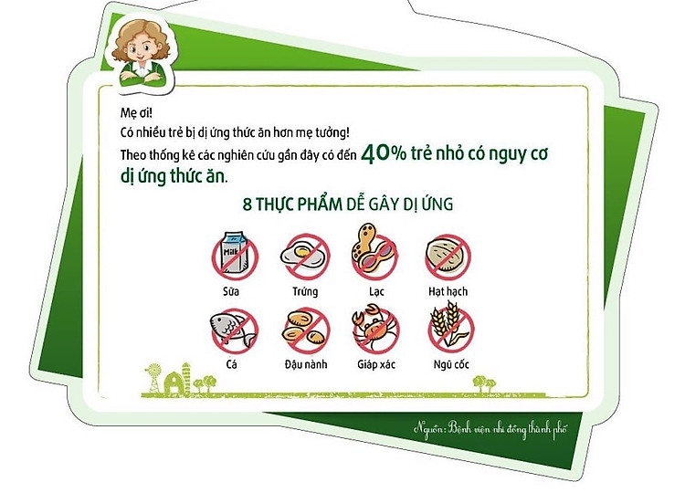 Mẹ biết lần đầu con làm quen với hương vị mới lạ, nên mẹ chọn những loại thức ăn lành tính nhất, không chứa 8 loại thực phẩm dễ gây dị ứng cho con.