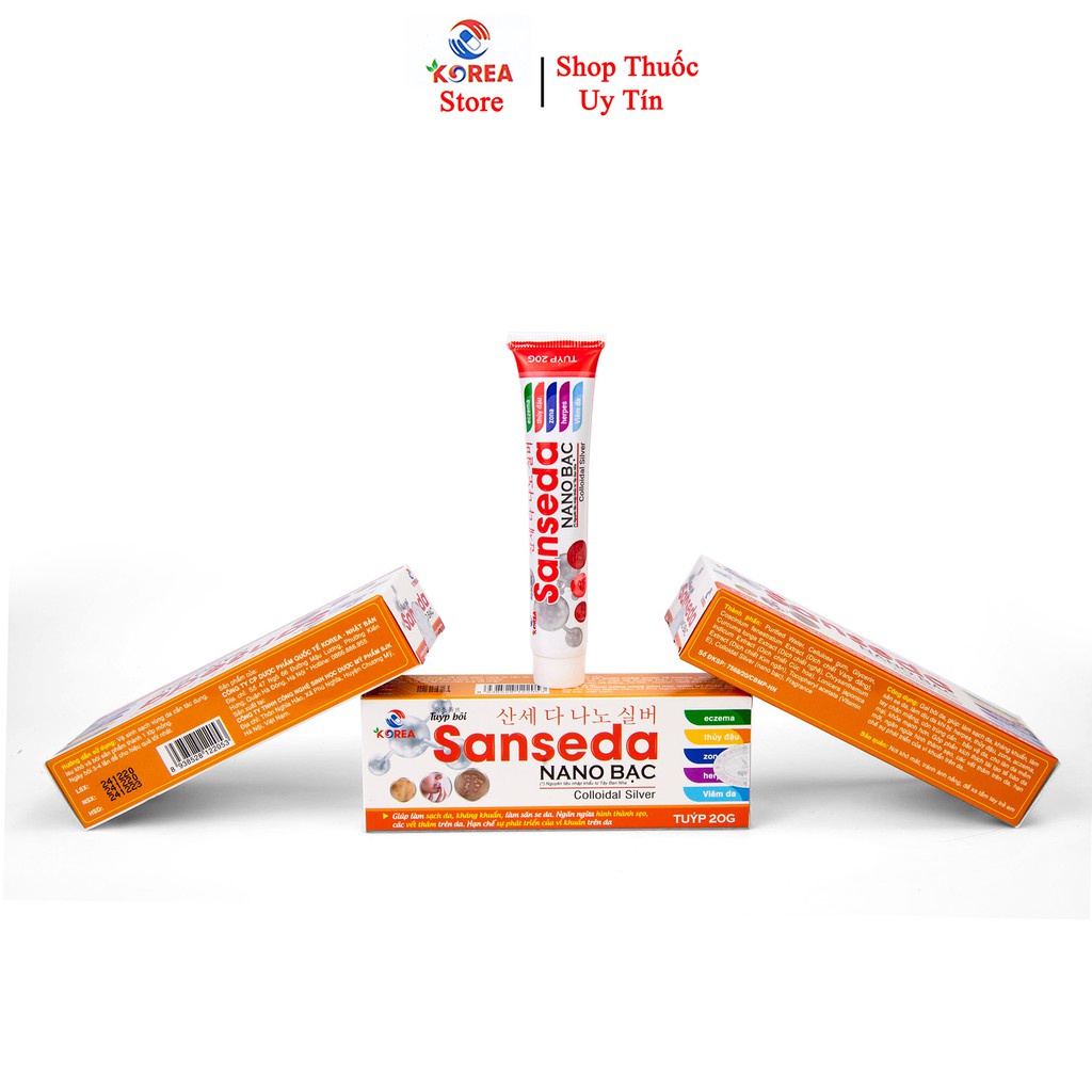 SANSEDA NANO BAC - TUÝP BÔI NGOÀI DA. * Thành phân: - Dịch chiết vàng đắng. - Dịch chiết nghệ. - Dịch chiết hoa cúc. - Dịch chiết kim ngân. - Vitamin E, Colloidal ( NANO BẠC) * Công dụng: - Có tác dụng trong rất nhiều trường hợp như:💗 làm sạch da, kháng khuẩn , làm săn se da , dịu da , kích thích tái tạo da mới , ngăn ngừa hình thành sẹo, các vết thâm trên da, hạn chế sự phát triển của vi khuẩn ⏩⏩ trong các trường hợp : ➡️herpes ➡️ thủy đậu ➡️ zona ➡️eczema ➡️ tay chân miệng ➡️ côn trùng đốt