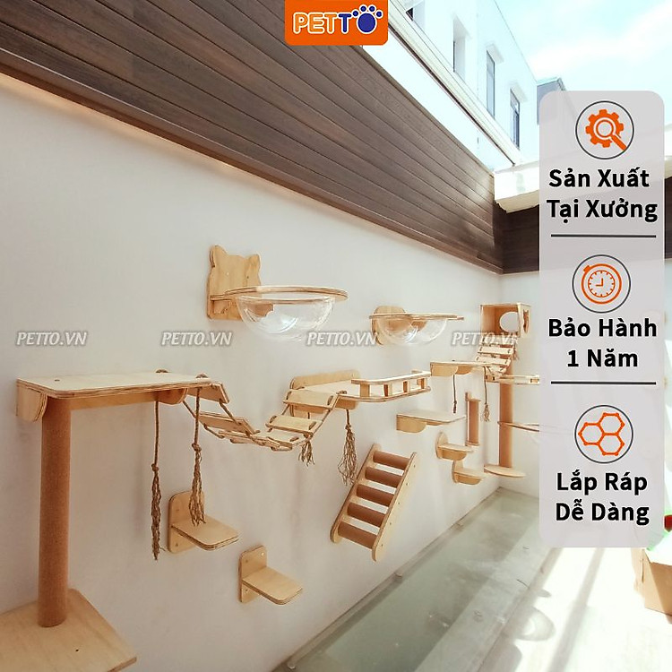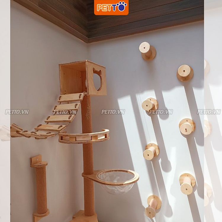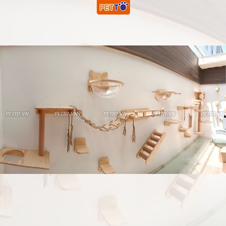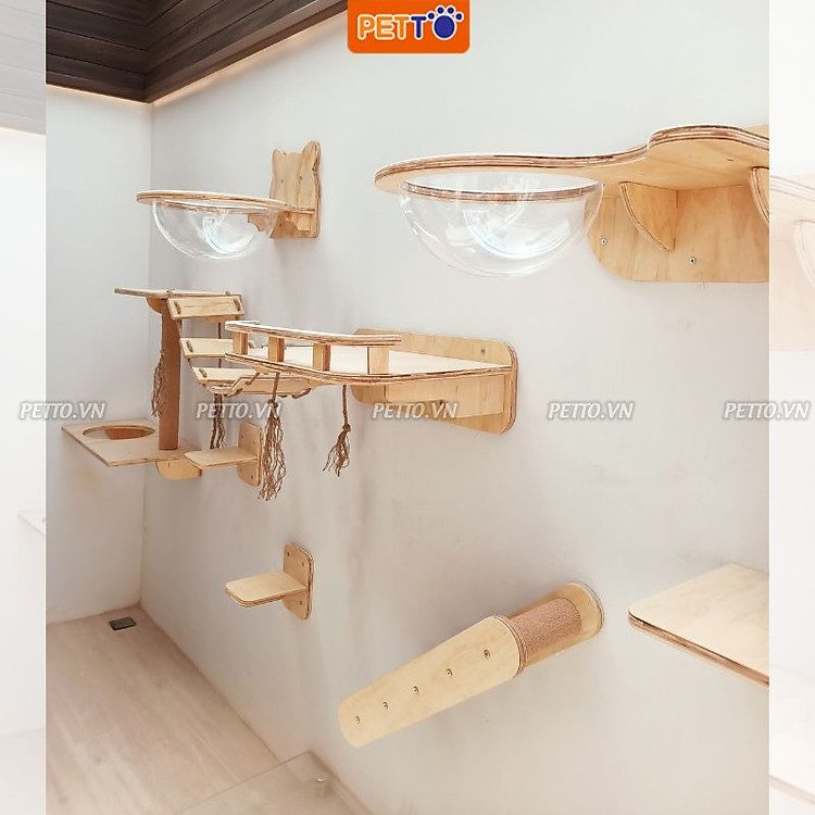 - Bộ đồ chơi cho mèo treo tường theo phong cách hiện đại rất tiện lợi cho những căn hộ chung cư hoặc ngôi nhà có diện tích nhỏ. Với chất liệu gỗ Plywood được chọn lựa kỹ lưỡng từ khâu đầu vào. Sản phẩm này sẽ mang đến cho boss nhà bạn một nơi ở tuyệt vời.