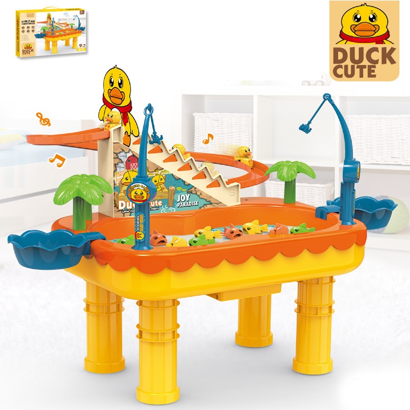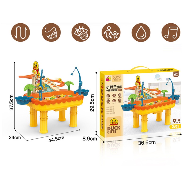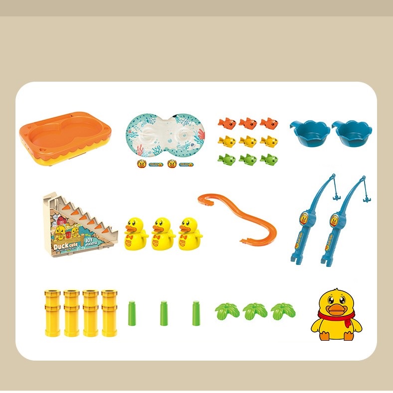 - Sản phẩm bộ câu cá gồm có bàn câu cá, 2 cần câu đi kèm, rổ đựng, vợt, máng trượt nước, quạt rẽ nước, nhiều cá khác nhau