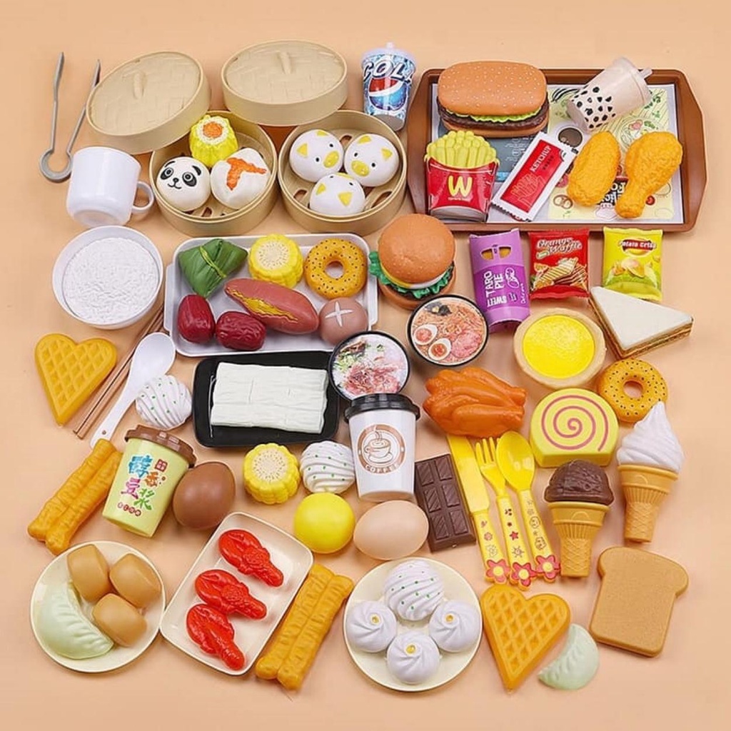 Bộ đồ chơi đang được các bố các mẹ mua dành cho các con chơi đồ hàng, nấu ăn, buôn bán, có bộ này các bé mê tít cho mà xem :)) Bộ Đồ Chơi Nấu Ăn Gồm Có 88 Món Đồ: Dimsum, mì gói, khoai tây chiên, bánh giò, bánh xếp, bánh tart, kem, bánh bao hấp....tất tần tật các thể loại món ăn ĐỒ CHƠI siêu CUTE. Tha hồ chơi đồ hàng, nấu ăn, buôn bán