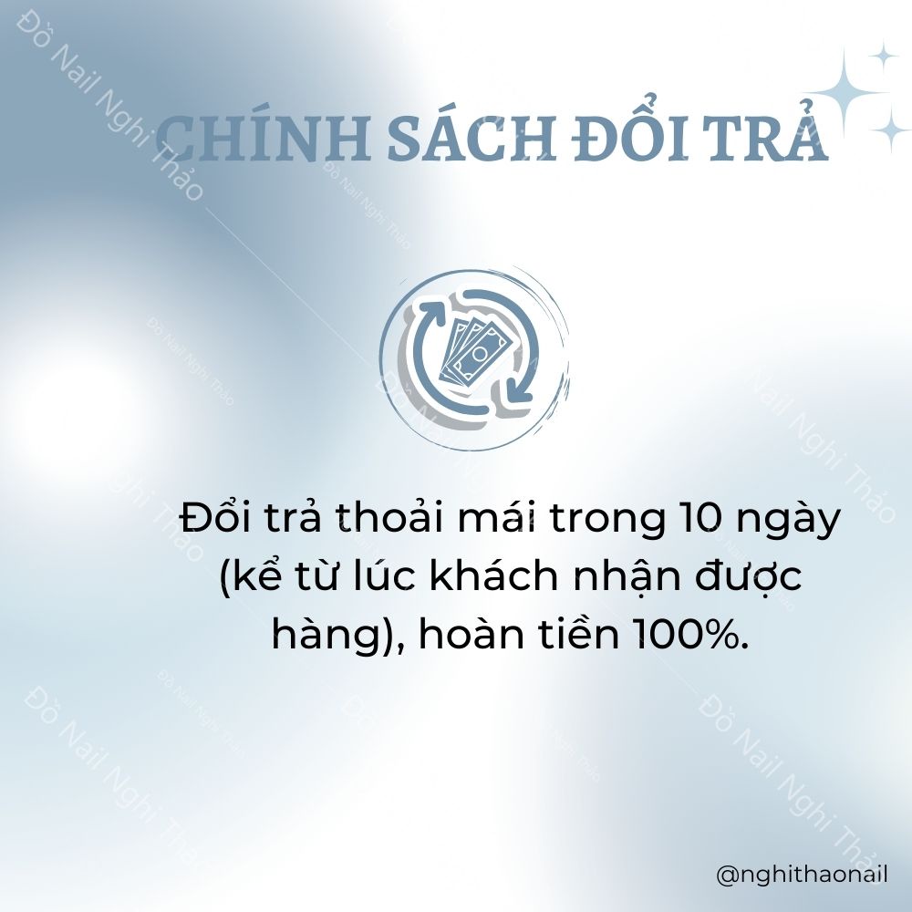 Chính sách đổi trả : 1. Chính sách đổi trả tất cả các sản phẩm (Kể cả đã bóc ra sử dụng) - Shop khuyến khích khách hàng kiểm tra hàng hóa ngay khi nhận hàng về tay và phản hồi lại với chúng tôi trong vòng 10 ngày. - Đổi trả thoải mái trong 10 ngày (kể từ lúc khách nhận được hàng). Không cần biết lí do, chỉ cần khách hàng không thích là được hỗ trợ đổi/ trả lại hàng, hoàn tiền 100%. Trường hợp sản phẩm bị lỗi, shop miễn phí ship đổi - trả. -Trường hợp sản phẩm không bị lỗi hoặc thời gian phản hồi muộn hơn 10 ngày thì khách vui lòng trả phí ship.2. Chính sách bảo hành theo sản phẩm lỗi - Đối với sản phẩm điện tử: Bảo hành đổi mới trong vòng 6 tháng kể từ ngày nhận hàng. - Đối với sản phẩm dung dịch: Bảo hành đổi mới trong vòng 1 tháng kể từ ngày nhận hàng. - Đối với sản phẩm còn lại: Bảo hành đổi mới trong vòng 10 ngày kể từ ngày nhận hàng. - Đối với sản phẩm còn lại: Bảo hành đổi mới trong vòng 10 ngày kể từ ngày nhận hàng. 3.Phí giao hàngMiễn phí hoàn toàn phí ship đổi trả 2 chiều trong 10 ngày đầu nếu sản phẩm có lỗi. #choi #phui #bui #nail #long #hong #choiphuibui #choinail #choiphuibuinail #phuibuinail #choilonghong #nghithao