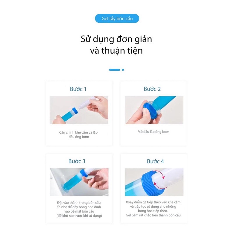 HƯỚNG DẪN SỬ DỤNG GEL BỒN CẦU - Quý khách lau khô vị trí cần bơm gel để gel có thể cố định chắc chắn. - Gel khử mùi bồn cầu hoạt động thông qua quá trình xả nước (gel bám chắc nên không bị nước xả trôi), một lượng nhỏ gel thơm bồn cầu sẽ bị hòa tan và tỏa ra hương thơm tự nhiên. - Thời gian sử dụng: một lần dùng được 3 - 5 ngày, một lọ dùng trong 4 - 8 tuần.