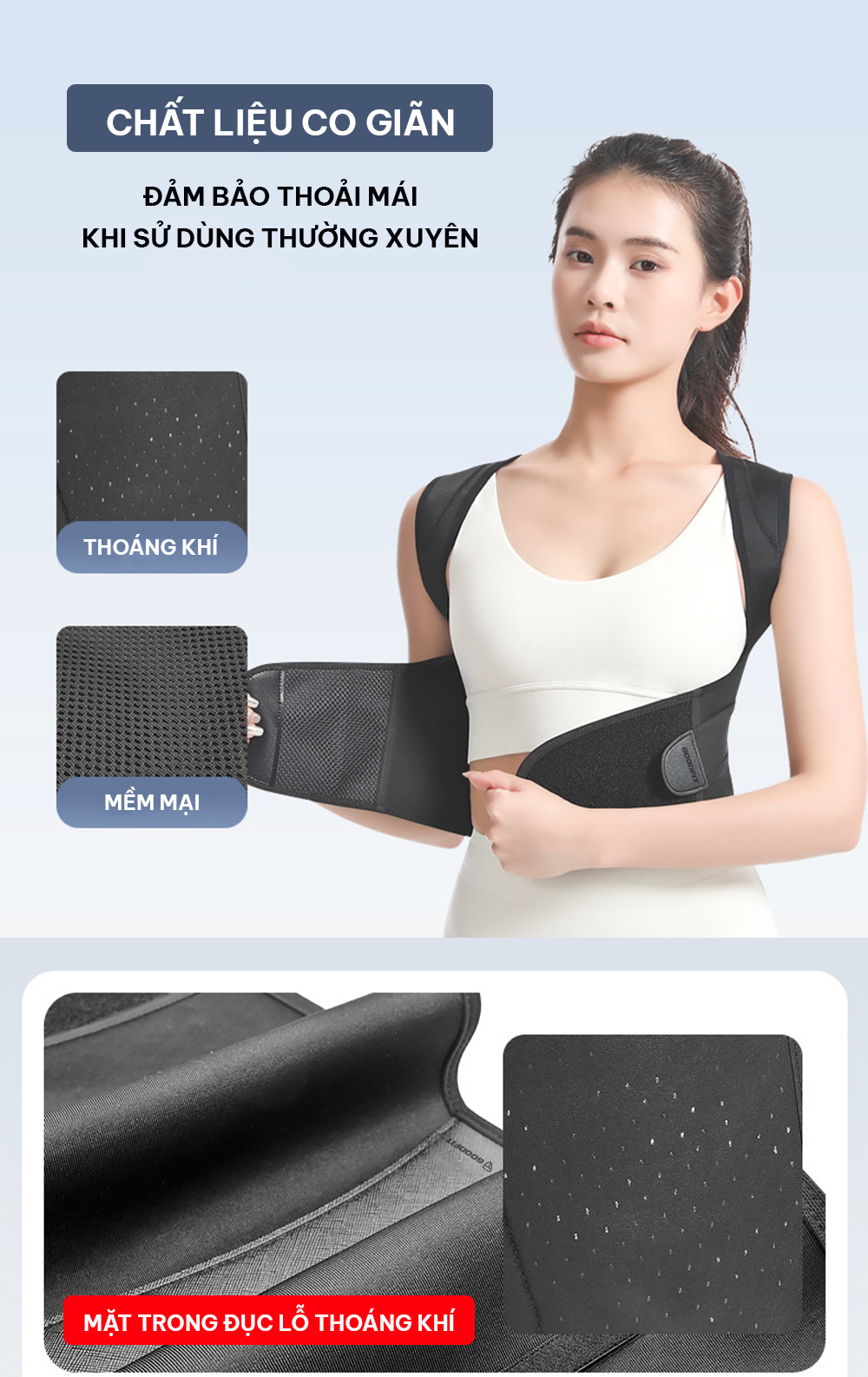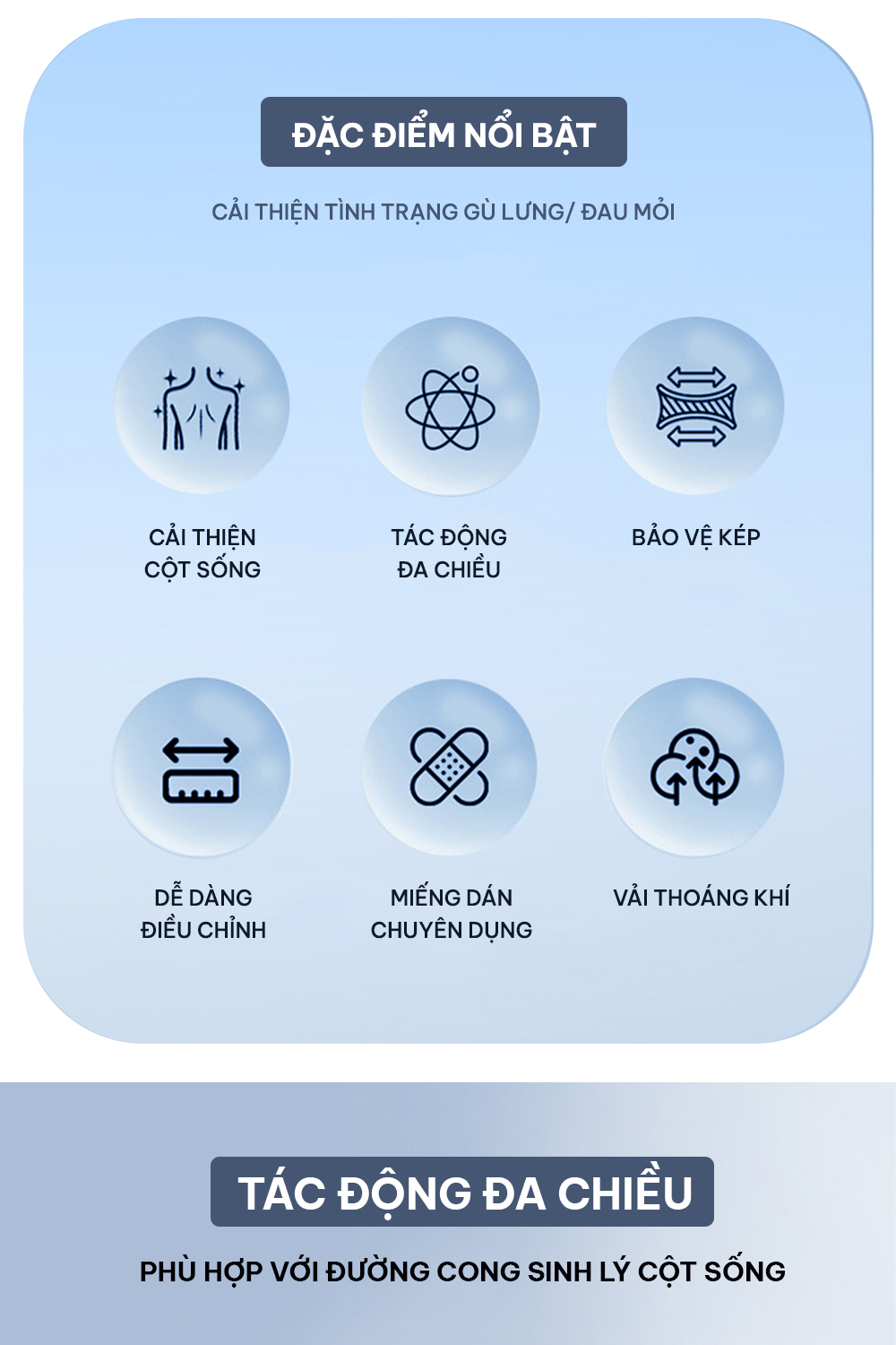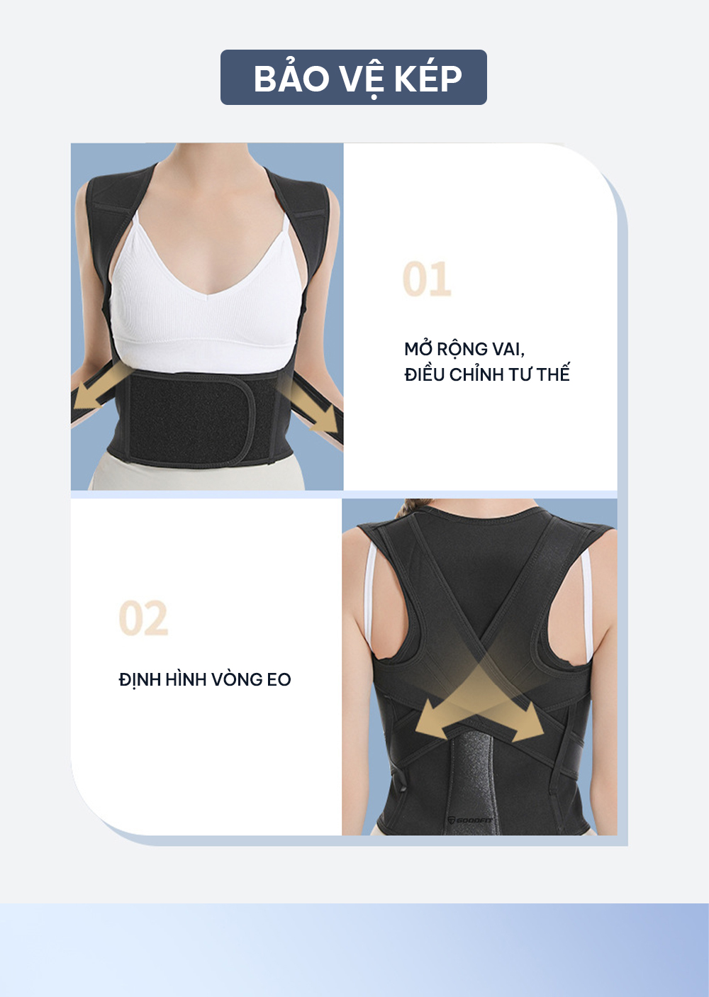 - Thiết kế dạng đai áo, phù hợp với đường cong sinh lý cột sống. Cơ chế bảo vệ kép giúp định giúp mở rộng điều chỉnh tư thế cột sống, vai đồng thời định hình vòng eo.