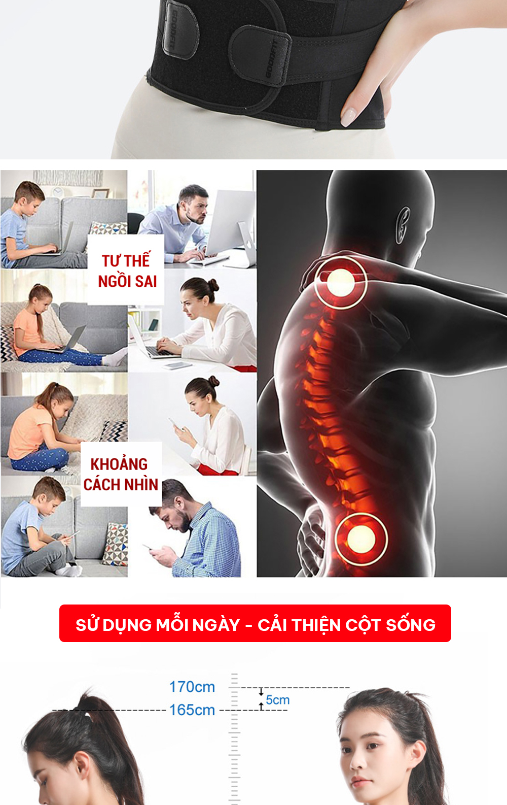 - Đai chống gù phù hợp dùng cho học sinh, sinh viên, nhân viên văn phòng, và những người làm việc trong môi trường ít vận động, nhằm giúp duy trì tư thế đúng và giảm nguy cơ mắc các vấn đề về cột sống, đau cổ, và đau vai gáy.