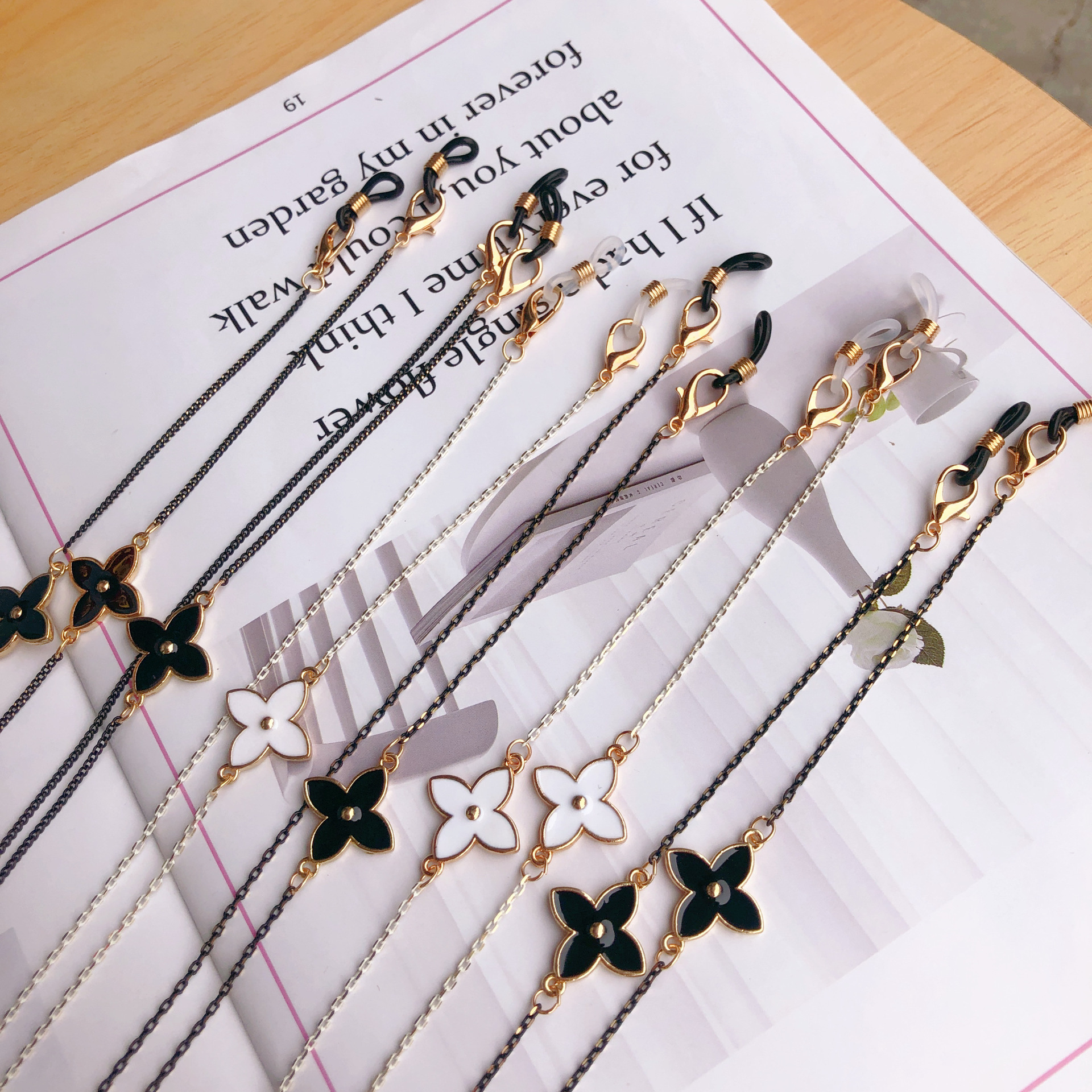 Chuỗi đeo mắt kính ngắn tone đen trắng mắt kính sành điệu hoa cỏ bốn lá dây chuyền đeo tai nghe bluetooth quà tặng đặc biệt