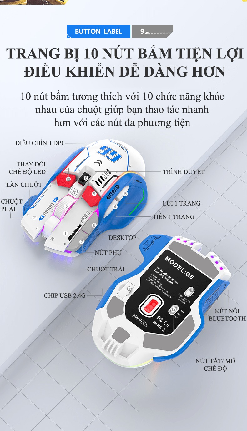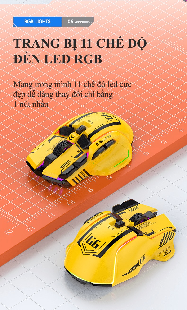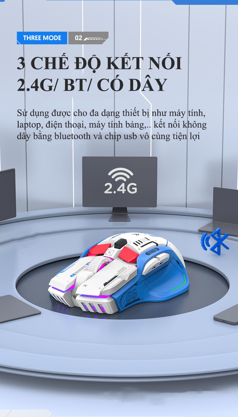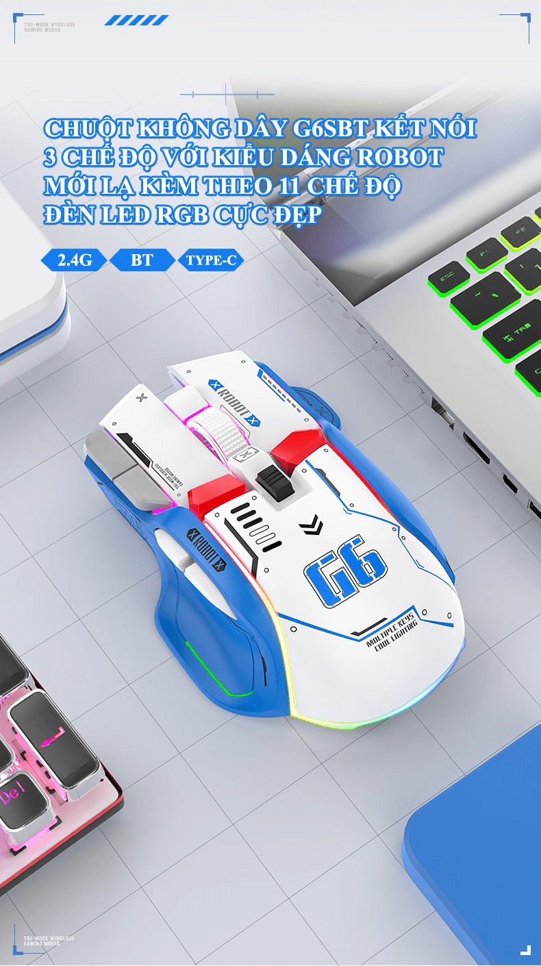 Giới thiệu Chuột không dây G6SBT kết nối 3 chế độ với kiểu dáng robot mới lạ kèm theo 11 chế độ led RGB cực đẹp - VL