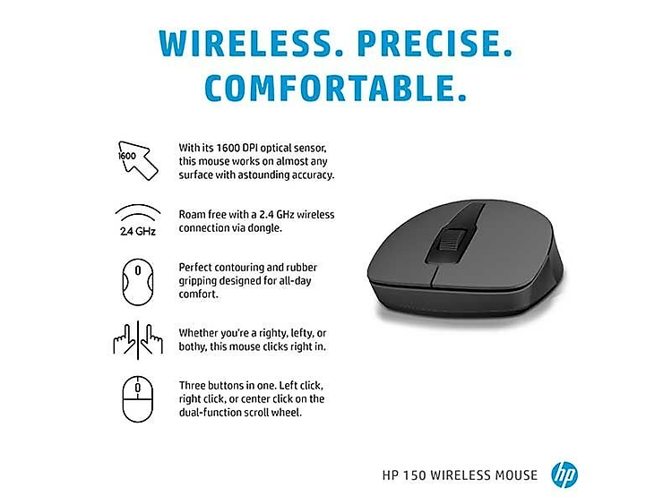 Chuột văn phòng HP 150 được trang bị kết nối không dây 2.4 GHz, giúp truyền dữ liệu nhanh chóng và ổn định. Bạn có thể sử dụng chuột mà không cần phải lo lắng về việc rối dây hay khoảng cách.