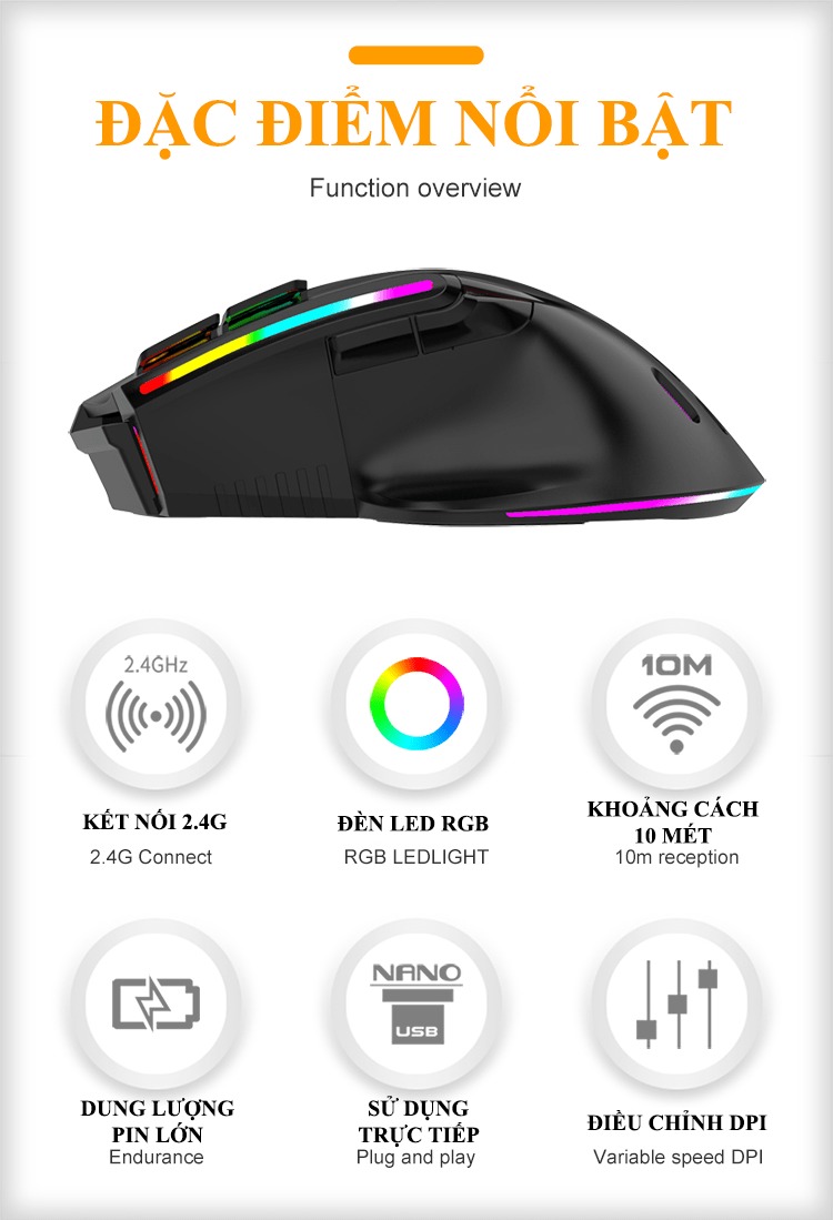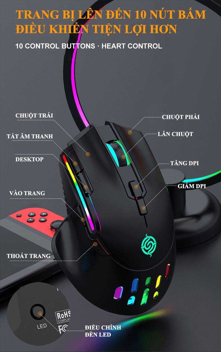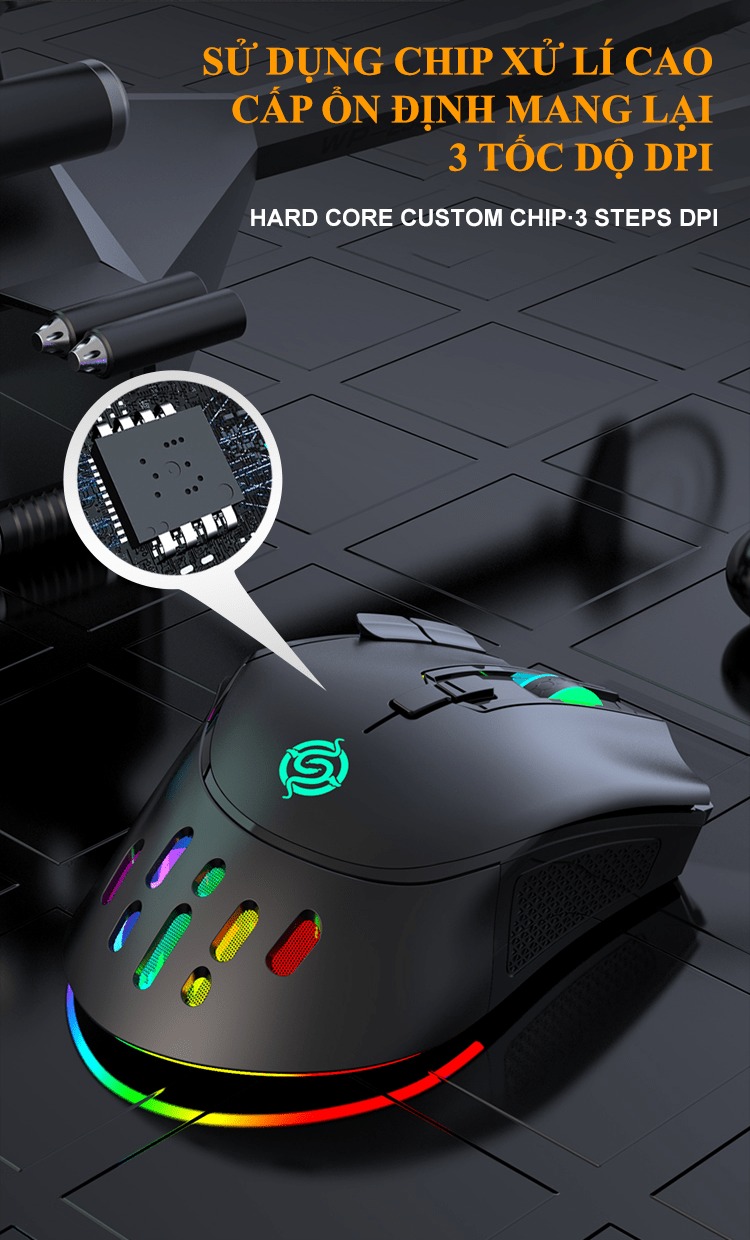 **Tính năng:RGB Chuột chơi game lấy độ chính xác cao cảm biến quang học, sở hữu 3 có thể điều chỉnh mức DPI (1200 - 2400 - 3200)Trang bị 10 nút bấm hỗ trợ thêm nhiêu chức năng tiện lợiDễ dàng hoạt độn...