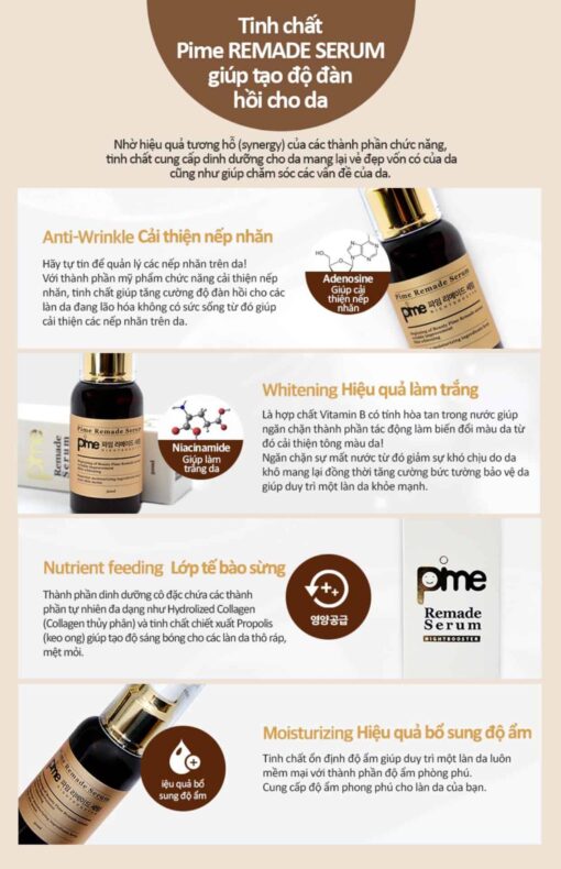 SERUM NỌC ONG PIME REMADE 50MLSERUM NỌC ONG PIME REMADE 50ML Khôi phục, tái sinh làn da: giúp kháng khuẩn, kháng viêm, giúp da giảm bớt chứng viêm nhiễm do những da bị nổi mẩn hay trứng cá