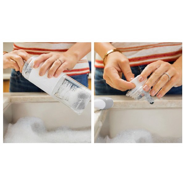Hướng dẫn sử dụng và bảo quản • Thấm bộ cọ vào nước rửa bình và bắt đầu cọ nhẹ nhàng bình sữa.