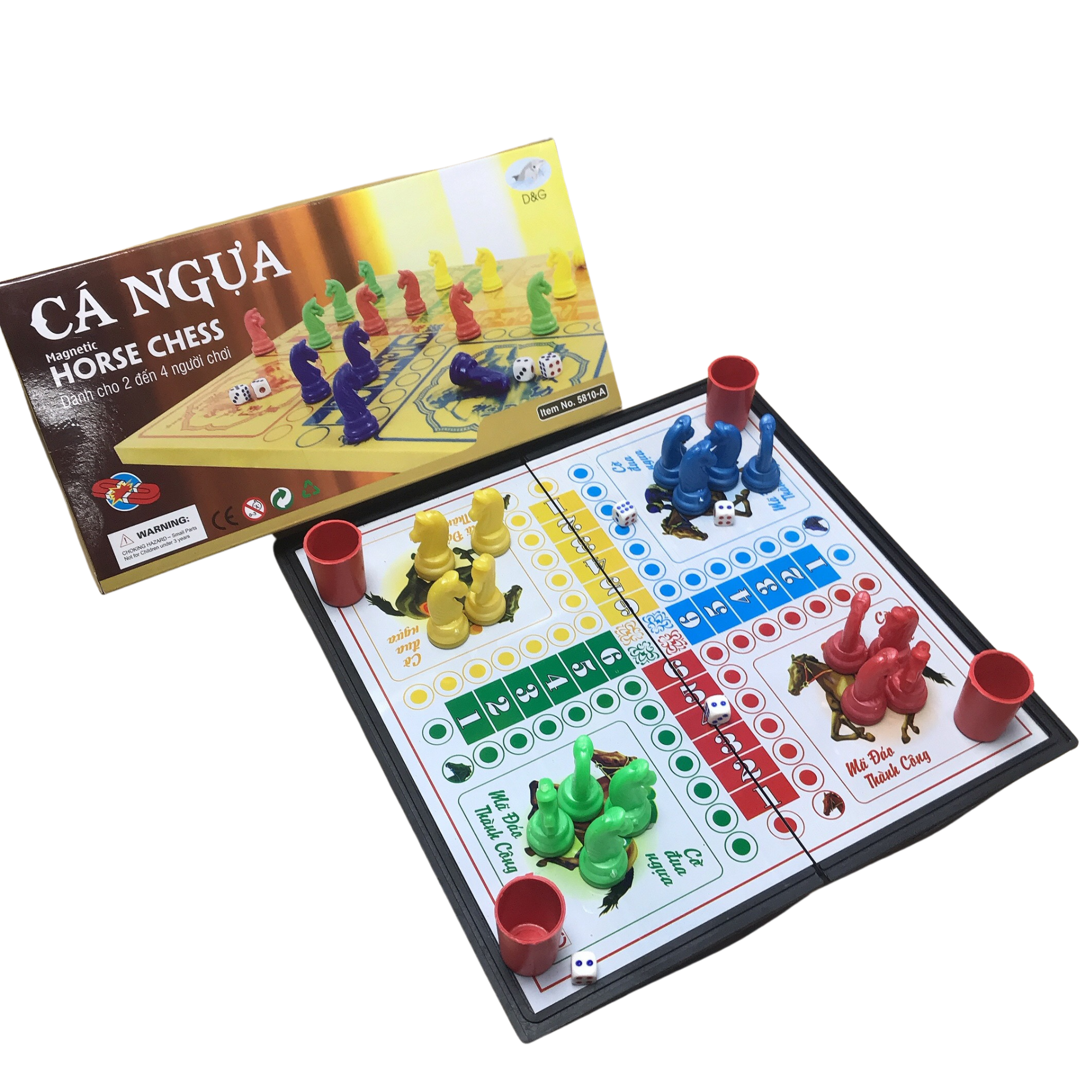 Sản phẩm bao gồm: 16 quân cá ngựa (4 màu), 4 viên xúc xắc, 4 cốc đổ xúc xắc.