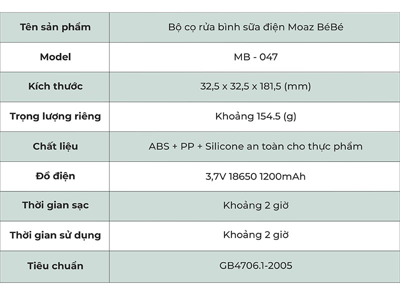 Sản phẩm bộ cọ rửa bình sữa điện Moaz Bébé MB – 047 có chất liệu nhựa PP, ABS và silicone bền bỉ, chịu nhiệt cao, an toàn. Sau khi sử dụng bố mẹ có thể tiệt trùng các đầu chổi để hạn chế vi khuẩn, nấm mốc.