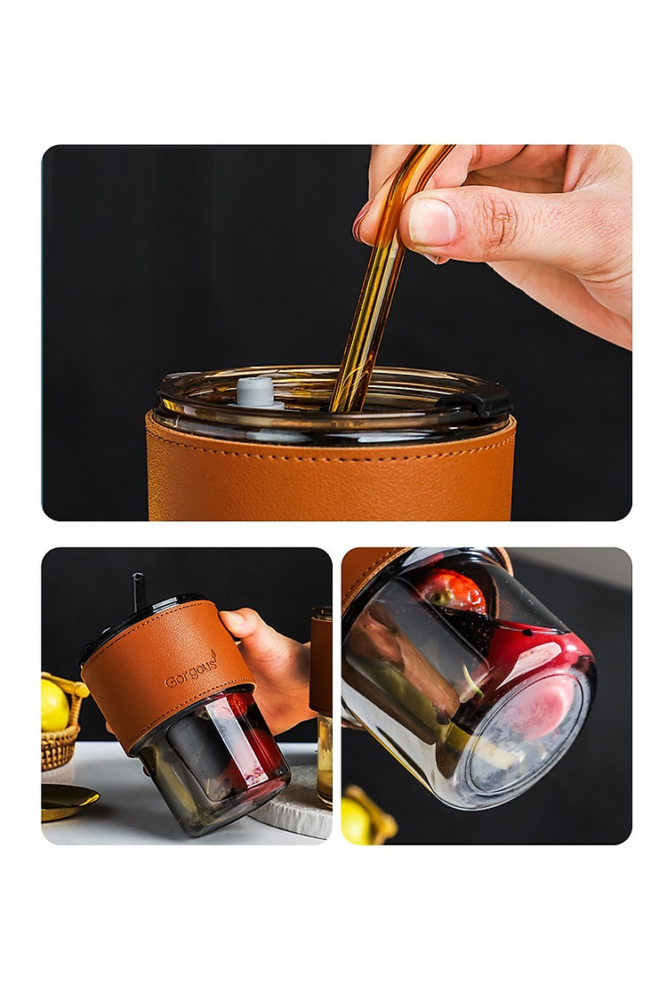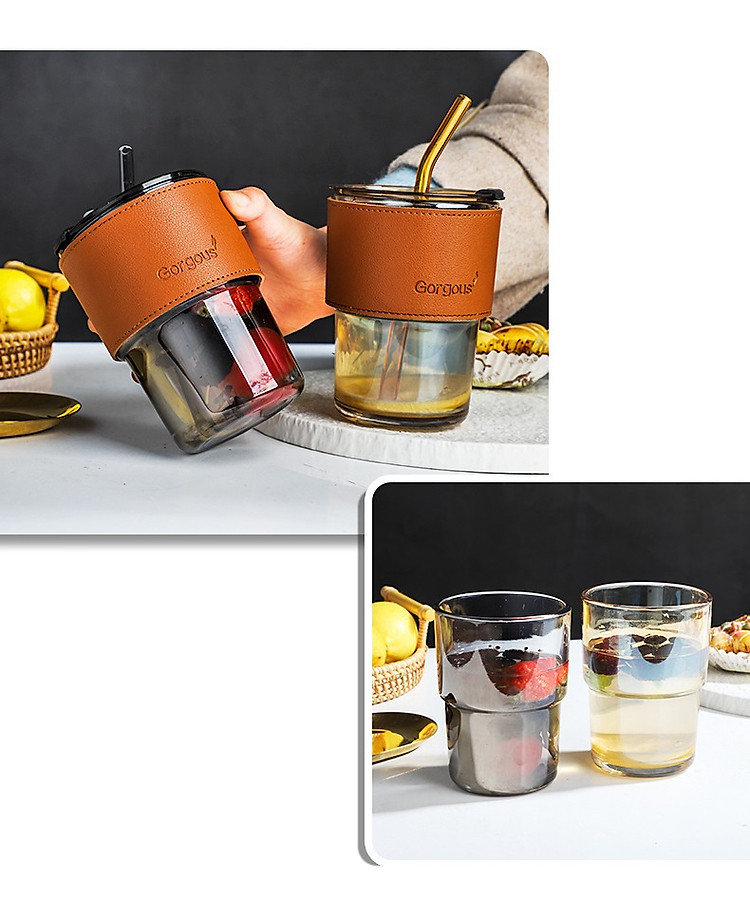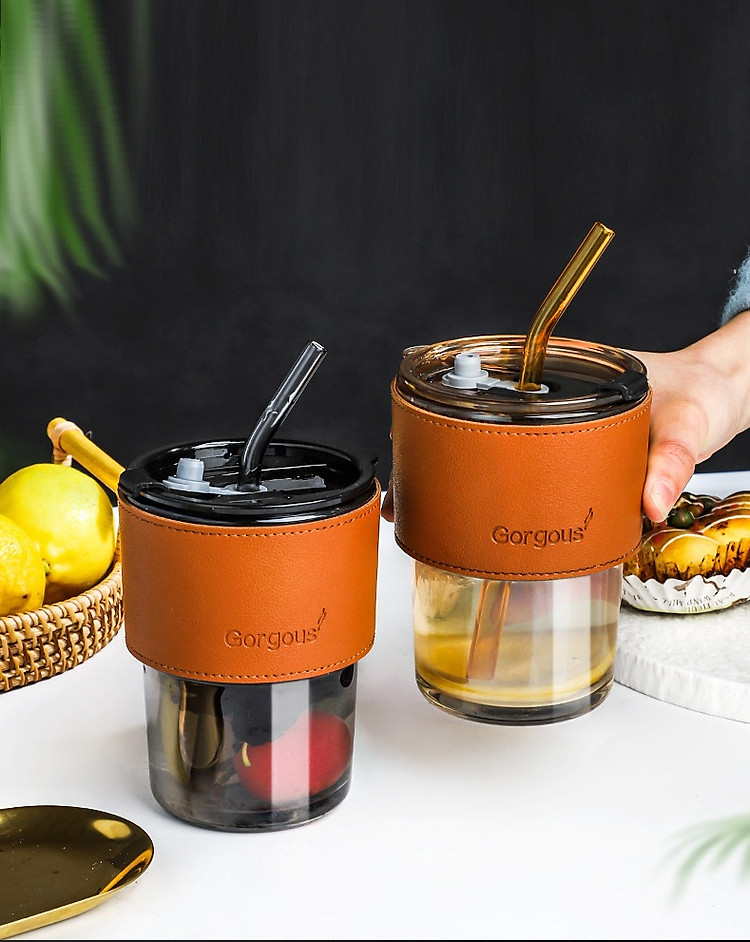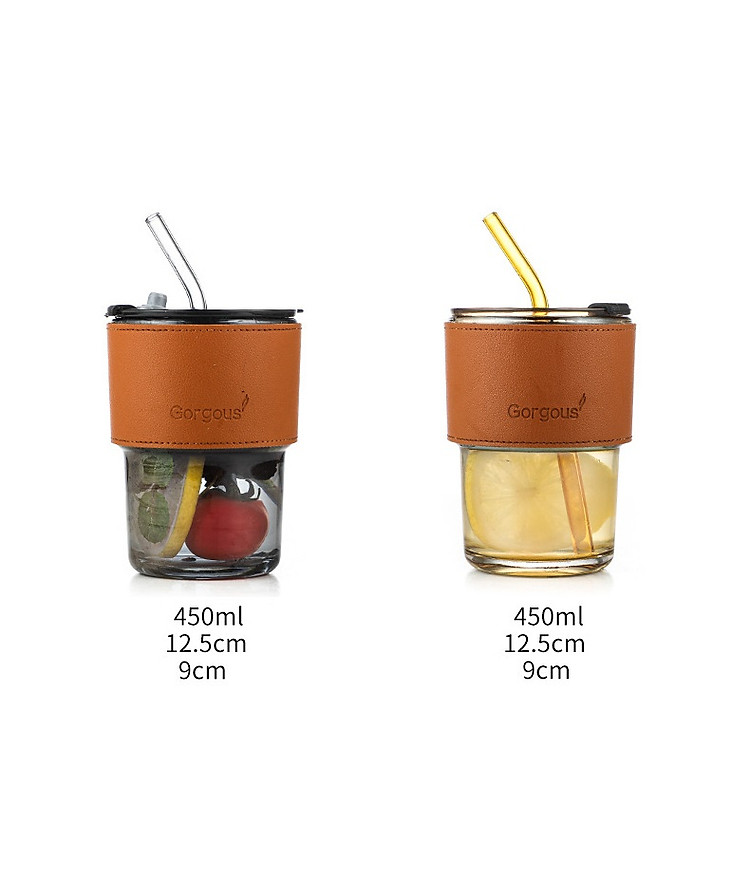 Cốc ly thủy tinh kèm ống hút bọc da chống bỏng chống rò rỉ cách nhiệt tốt 450 ml