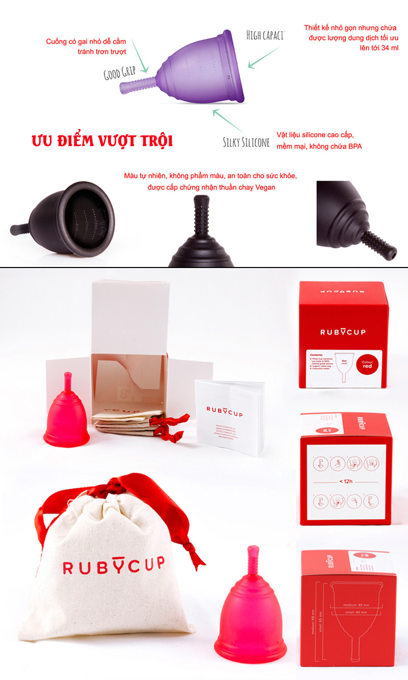 - An toàn cho sức khỏe, phù hợp với lối sống năng động: Cốc Ruby được làm từ 100% Silicone mềm, không có chất dẻo, không cao su, không chất độc và không chất tẩy trắng. Bạn có thể thoải mái vận động, làm việc yêu thích: đi bơi, du lịch, tập yoga... trong ngày kinh nguyệt.