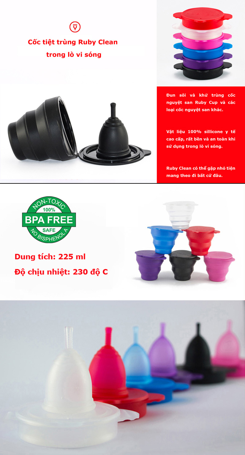 Đề vệ sinh và tiệt trùng cốc nguyệt san nhanh chóng, an toàn, khách hàng nên cân nhắc sử dụng thêm sản phẩm cốc tiệt trùng Ruby Clean để đun sôi tiệt trùng cốc nguyệt san trong lò vi sóng. Đây là sản phẩm chuyên dụng dùng để tiệt trùng cốc nguyệt san được sản xuất bởi hãng Rubycup (Anh)