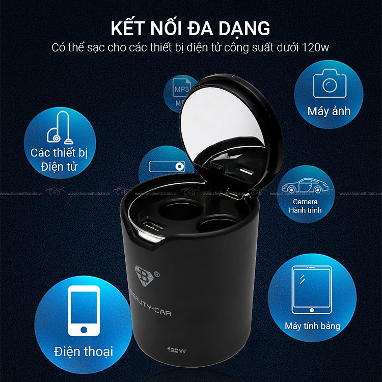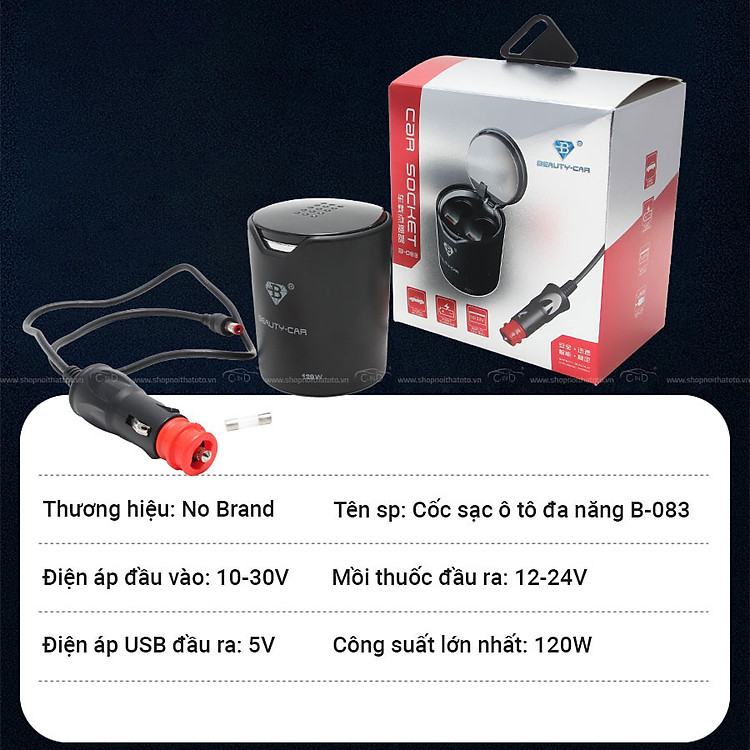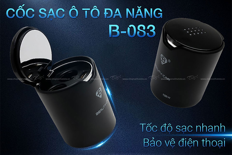 - Cốc sạc ô tô 2 ổ và 2 cổng USB có dây B-083 màu đen với thiết kế sang trọng cứng cáp, có tốc độ sạc nhanh và bảo vệ tối đa cho điện thoại. Sản phẩm có thể sử dụng sạc cho nhiều thiết bị điện tử công suất lên đến 120W như điện thoại, máy tính bảng, giá đỡ điện thoại hay camera hành trình giúp những chuyến đi của bạn được hỗ trợ tốt nhất và phát huy tối ưu công dụng của mình trên những chặng đường dài.