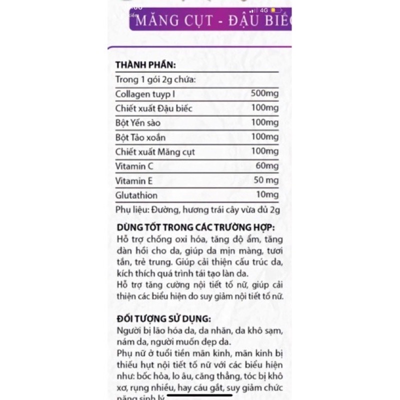 Thành Phần: Thành phần : _ Collagen tuyp 1 _ Chiết xuất đậu biếc _ Bột yến sào _ Bột tảo xoắn _ Chiết xuất măng cụt _ Vitamin C _ Vitamin E _ Glutathion _ Hương trái cây vừa đủ