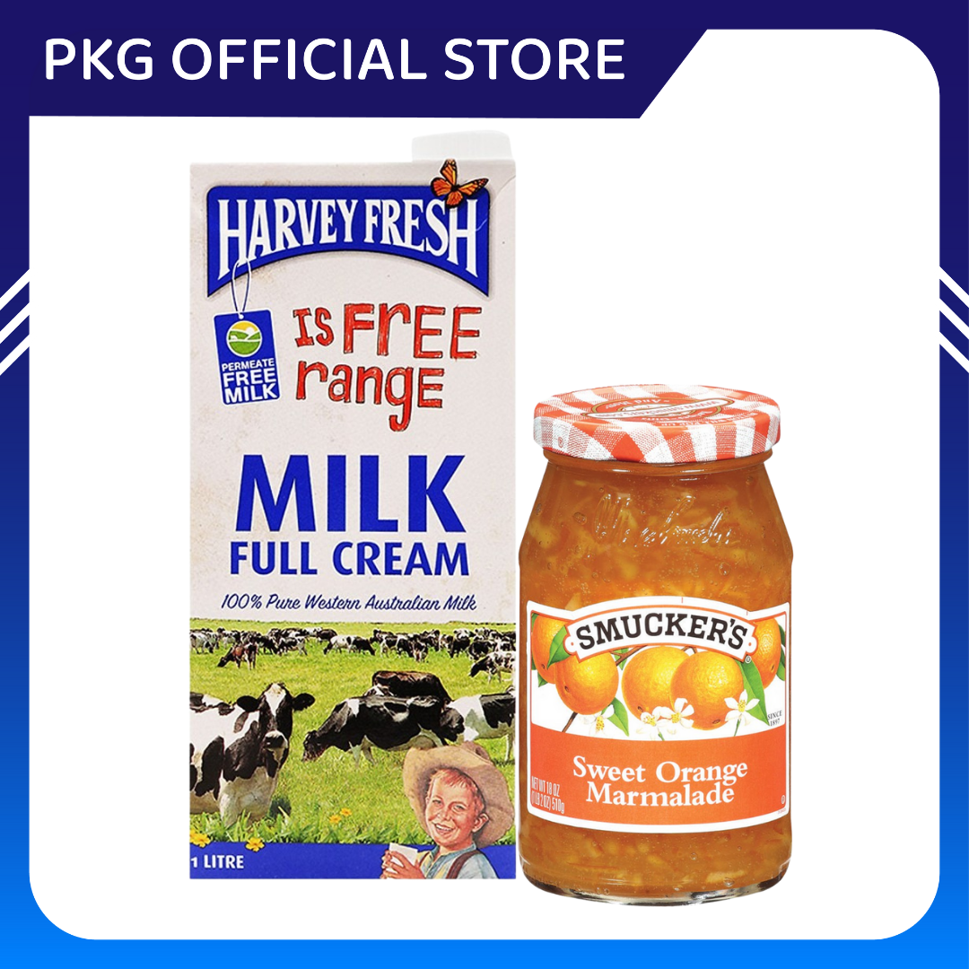 Sữa Tươi Tiệt Trùng Nguyên Kem Harvey Fresh và Mứt Cam Ngọt Smucker's kết hợp với bánh mì, tạo nên một bữa sáng đầu đủ dinh dưỡng và nhanh chóng thích hợp cho những người bận rộn.