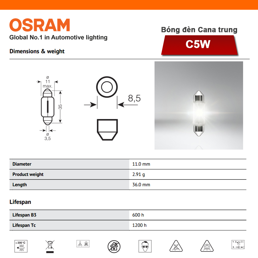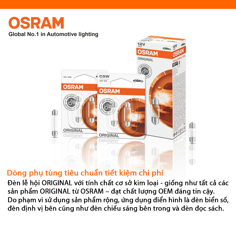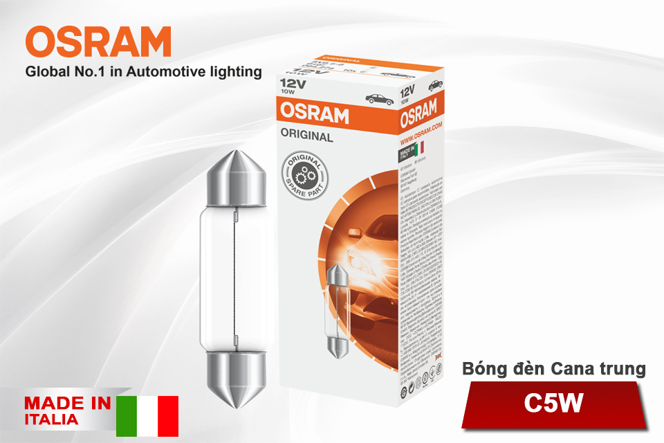 - Bóng đèn Cana trung OSRAM ORIGINAL C5W 12v 10w được chế tạo bằng thủy tinh cao cấp đạt tuổi thọ sử dụng cao giúp hỗ trợ chiếu sáng hiệu quả trên những chặng đường dài