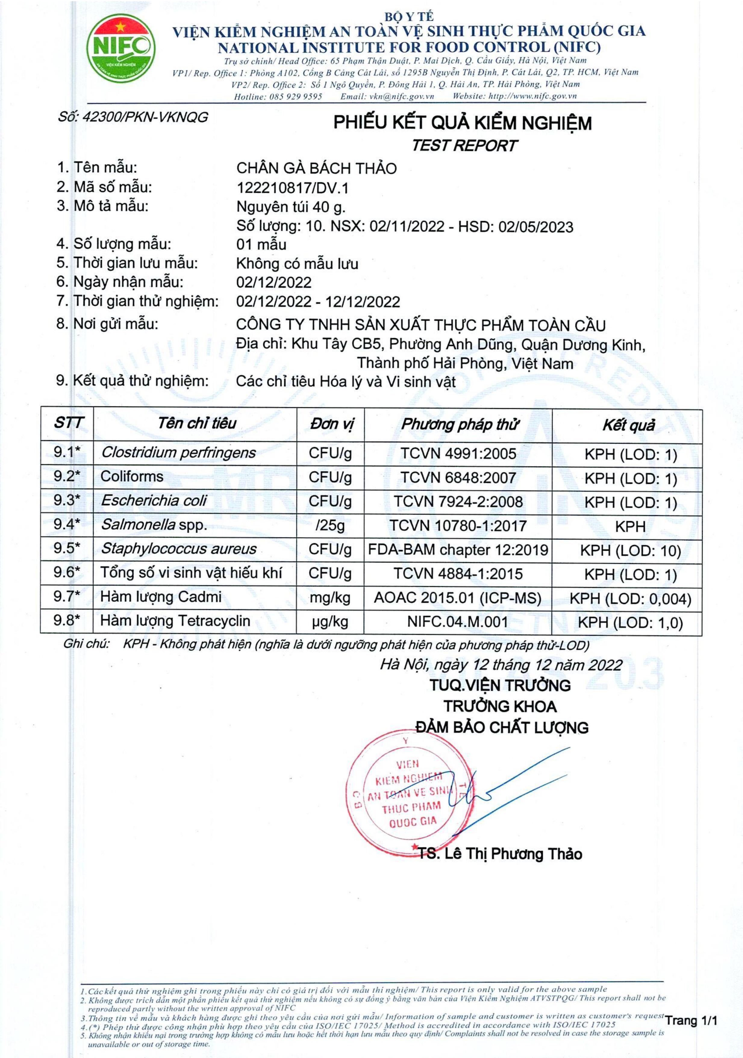 Sản phẩm đã được kiểm nghiệm phù hợp tiêu chuẩn an toàn vệ sinh thực phẩm