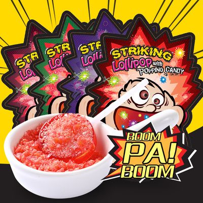 Striking Lollipop With Topping Candy: là loại kẹo nổ gồm 1 cây kẹo lollipop với hình dáng ngộ nghĩnh với bột kẹo nổ.