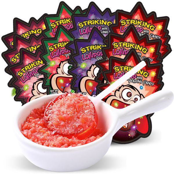 Striking Lollipop With Topping Candy: là loại kẹo nổ gồm 1 cây kẹo lollipop với hình dáng ngộ nghĩnh với bột kẹo nổ.