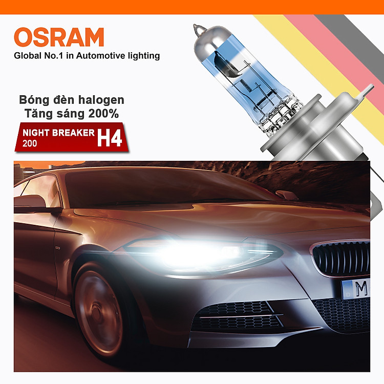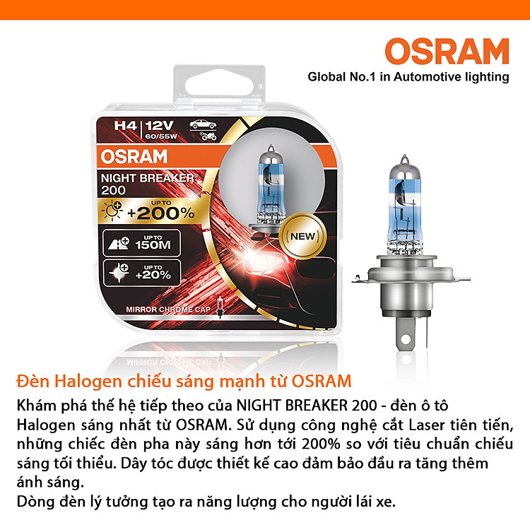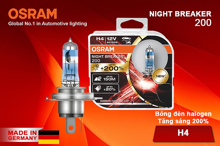 Combo 2 Bóng Đèn Halogen Tăng Sáng 200% OSRAM Night Breaker H4 64193NB200 12V 60/55W được chế tạo bằng thủy tinh cao cấp đạt tuổi thọ sử dụng cao thêm 2 lần giúp hỗ trợ chiếu sáng hiệu quả trên những chặng đường dài
