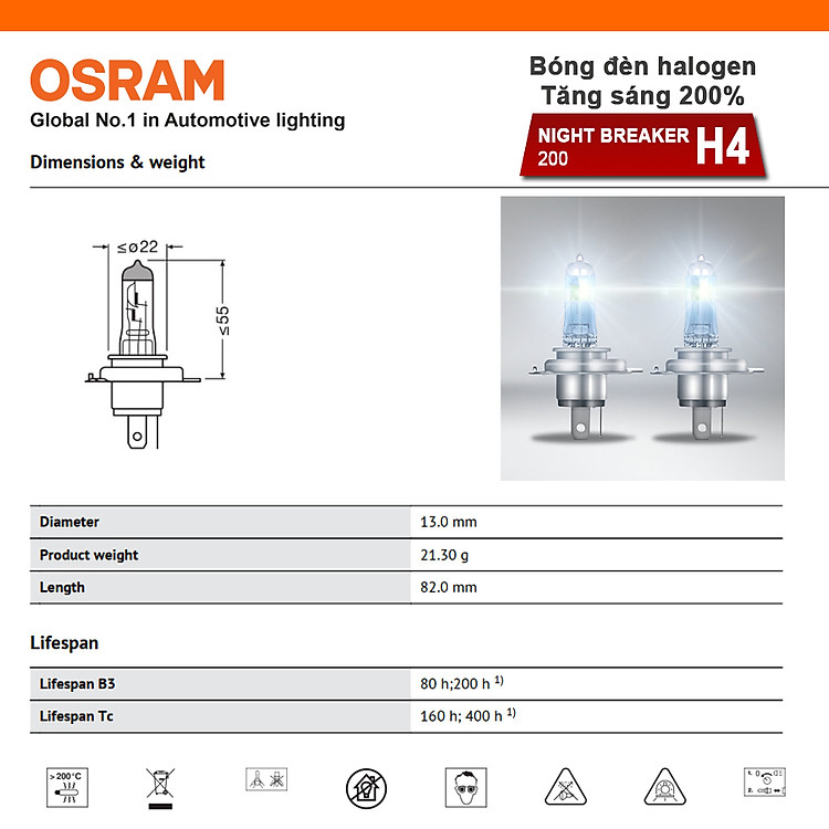 Hướng dẫn sử dụng và bảo quản Combo 2 Bóng Đèn Halogen Tăng Sáng 200% OSRAM Night Breaker H4 64193NB200 12V 60/55W