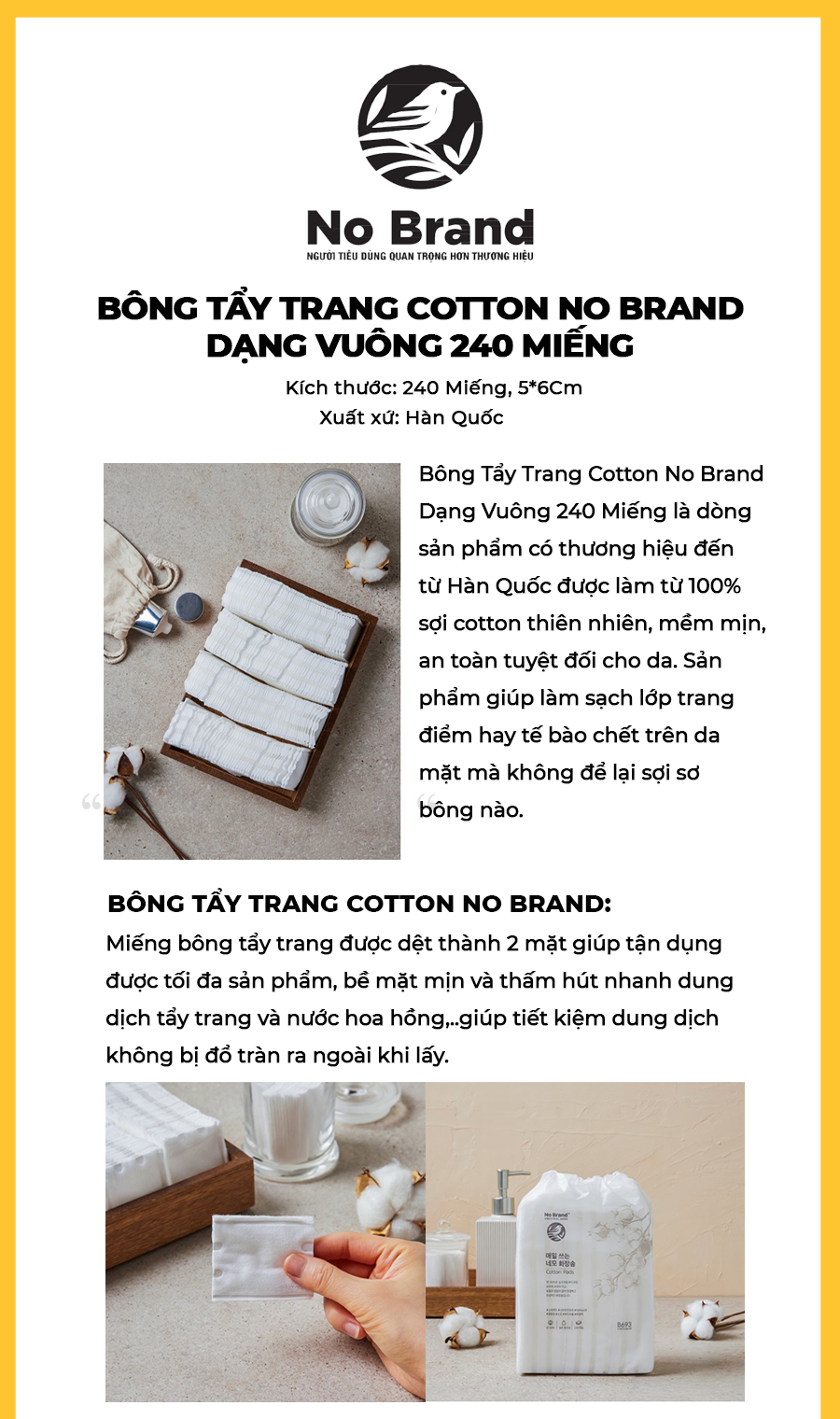 Bông Tẩy Trang Cotton No Brand Dạng Vuông 240 Miếng là dòng sản phẩm có thương hiệu đến từ Hàn Quốc được làm từ 100% sợi cotton thiên nhiên, mềm mịn, an toàn tuyệt đối cho da. Sản phẩm giúp làm sạch lớp trang điểm hay tế bào chết trên da mặt mà không để lại sợi sơ bông nào.