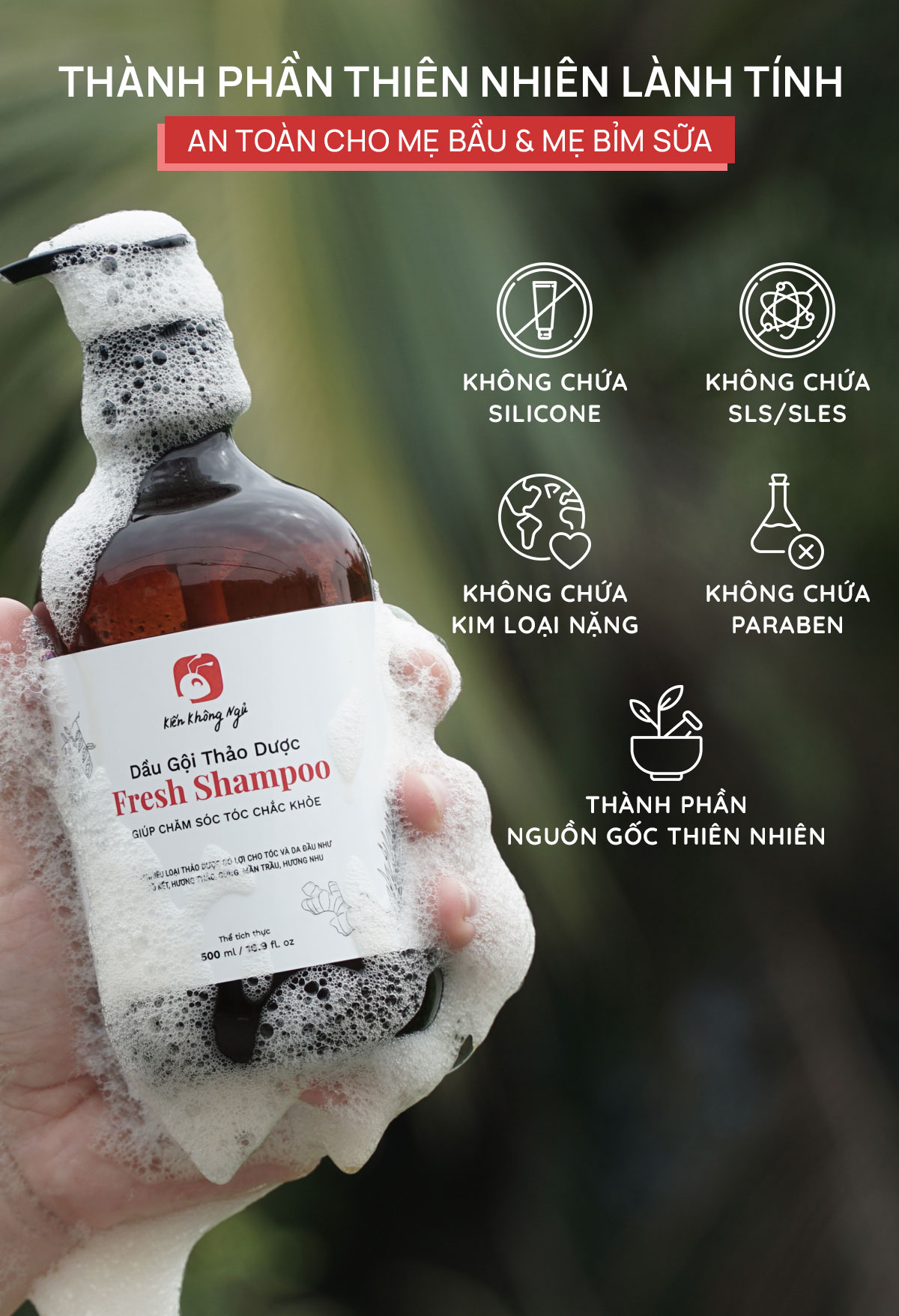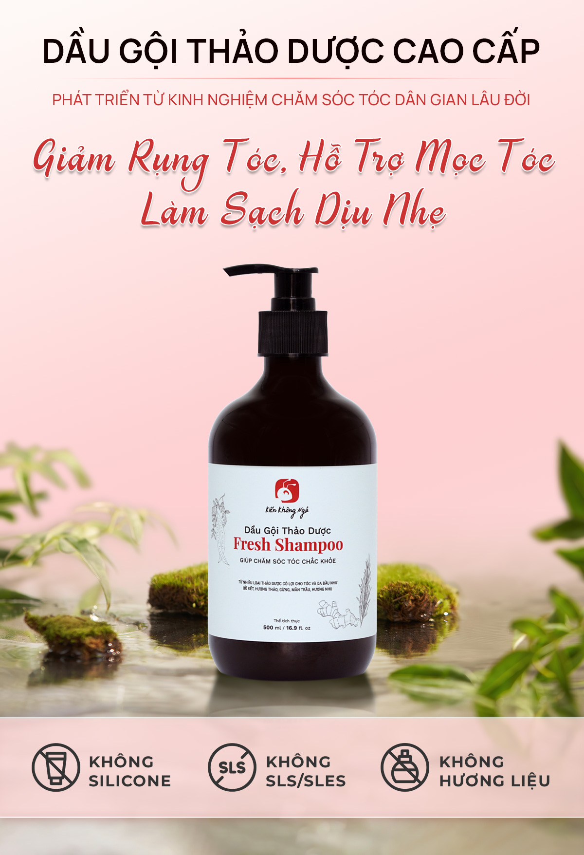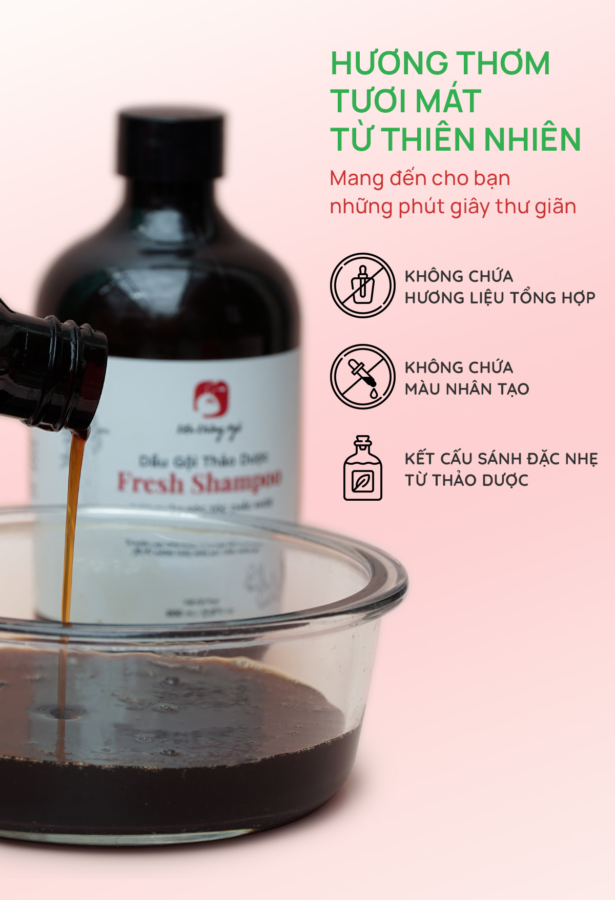 Dựa trên kinh nghiệm chăm sóc tóc dân gian lâu đời, kết hợp với những nghiên cứu hiện đại, dầu gội thảo dược Fresh Shampoo được tạo ra từ các thành phần thảo dược có lợi cho tóc và da đầu như Bồ kết, Hương thảo, Gừng, Cỏ mần trầu, Hương nhu, Đương quy, Đảng sâm... Giúp nuôi dưỡng và chăm sóc tóc từ gốc, ngăn ngừa và cải thiện tình trạng tóc khô, xơ, chẻ ngọn. Giảm gàu, giảm gãy rụng, hỗ trợ mọc tóc, cho mái tóc mềm mượt, chắc khỏe hơn.