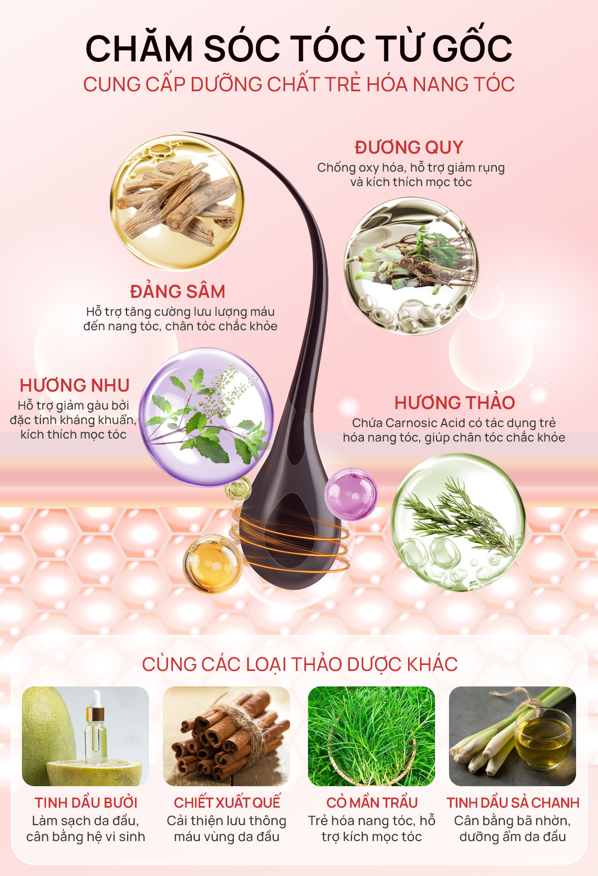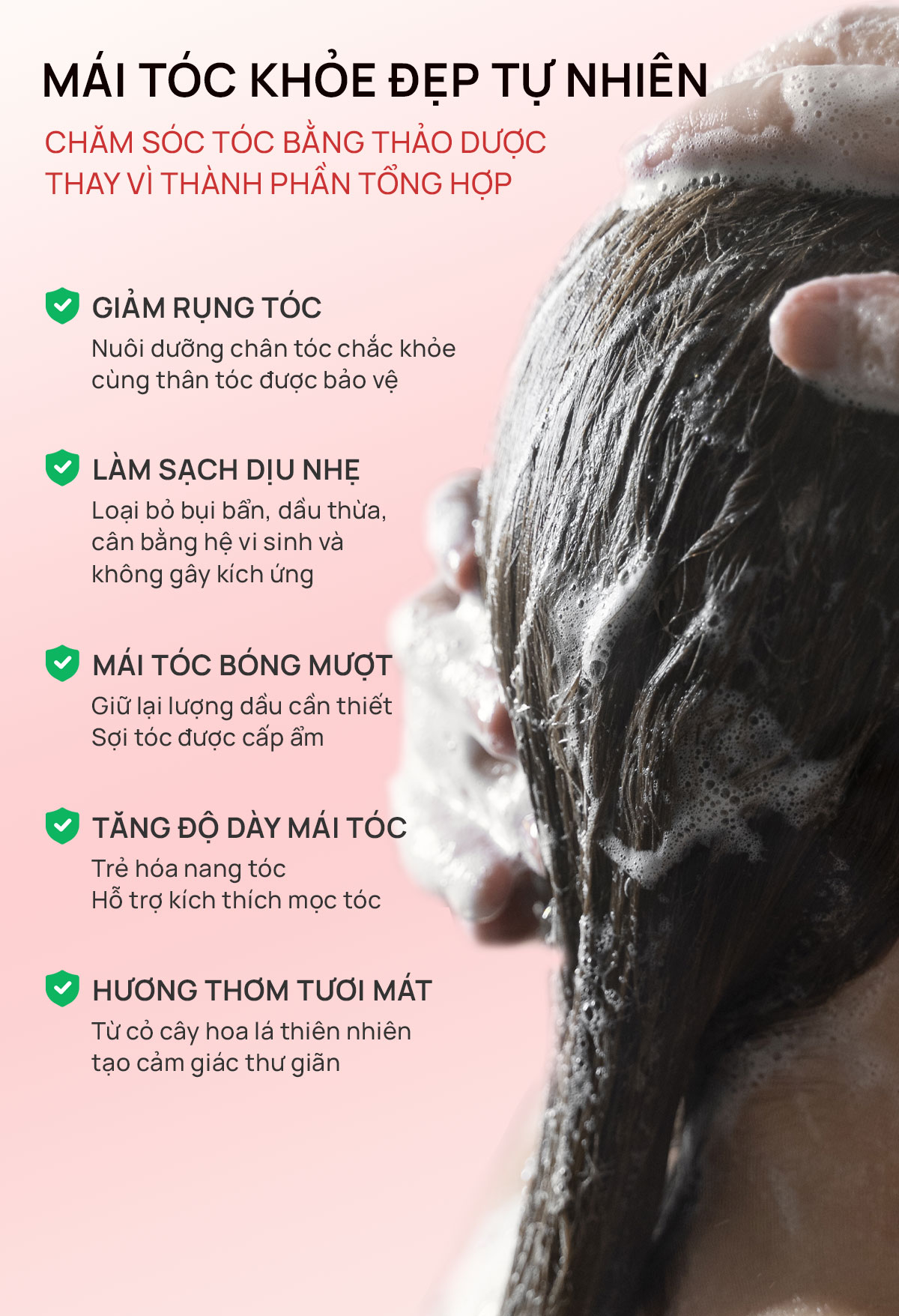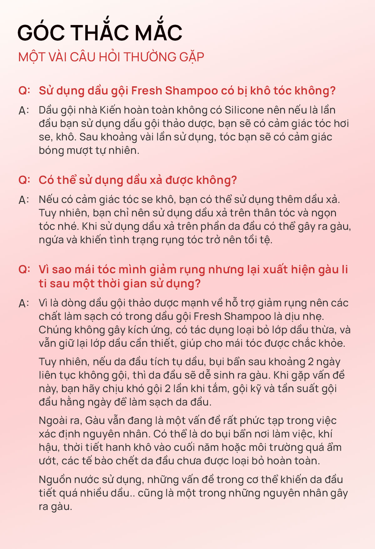 Dựa trên kinh nghiệm chăm sóc tóc dân gian lâu đời, kết hợp với những nghiên cứu hiện đại, dầu gội thảo dược Fresh Shampoo được tạo ra từ các thành phần thảo dược có lợi cho tóc và da đầu như Bồ kết, Hương thảo, Gừng, Cỏ mần trầu, Hương nhu, Đương quy, Đảng sâm... Giúp nuôi dưỡng và chăm sóc tóc từ gốc, ngăn ngừa và cải thiện tình trạng tóc khô, xơ, chẻ ngọn. Giảm gàu, giảm gãy rụng, hỗ trợ mọc tóc, cho mái tóc mềm mượt, chắc khỏe hơn.