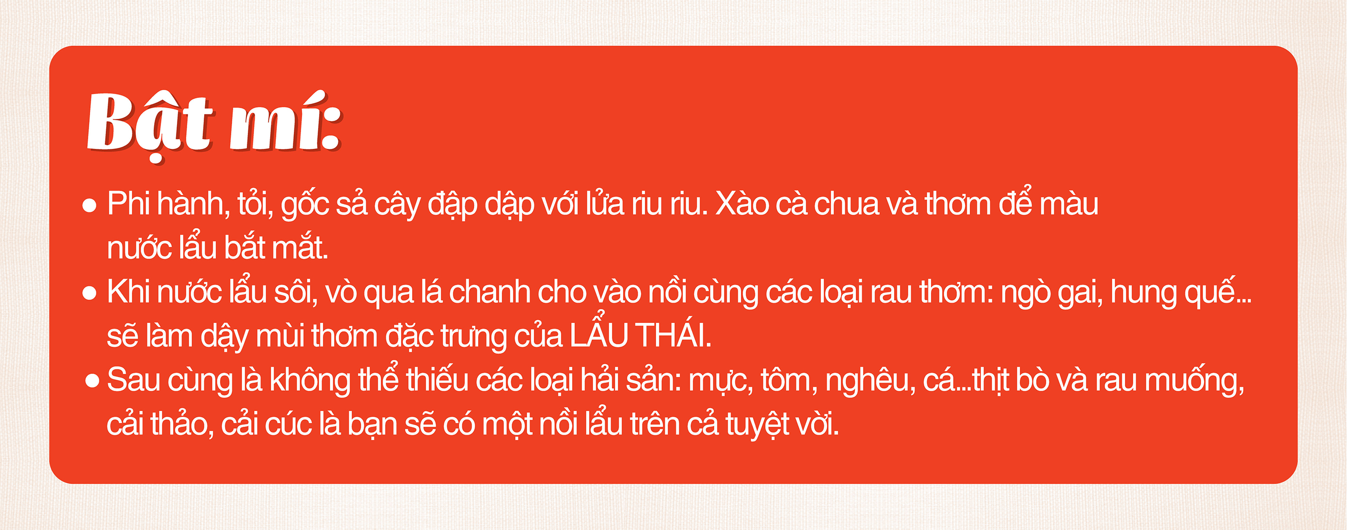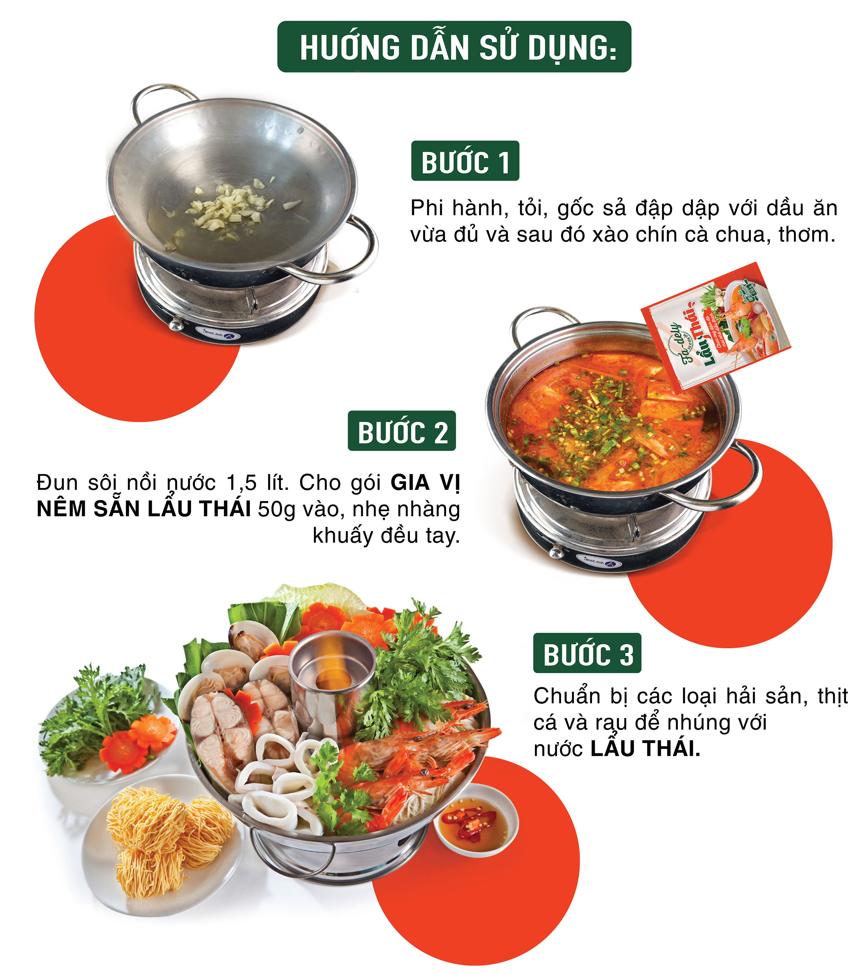 Hướng dẫn sử dụng | Gồm 03 bước đơn giản:Bước 1: Phi hành, tỏi và gốc sả đập dập với dầu ăn vừa đủ rồi sau đó xào chín cà chua và thơm.Bước 2: Đun sôi nồi nước 1,5 lít. Cho gói Gia vị nêm sẵn Lẩu Thái Fadely 50g vào và nhẹ nhàng khuấy đều tay.Bước 3: Chuẩn bị các loại hải sản, thịt cá và rau để nhúng với nước lẩu Thái. |