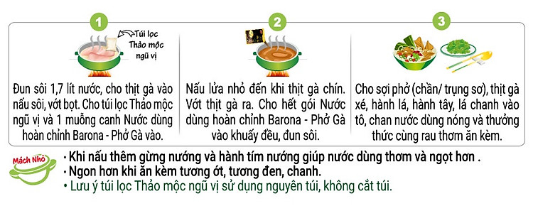 - Sử dụng 1 gói Nước Dùng Hoàn Chỉnh Barona - Phở Gà 145g cho khẩu phần 4-5 người ăn.