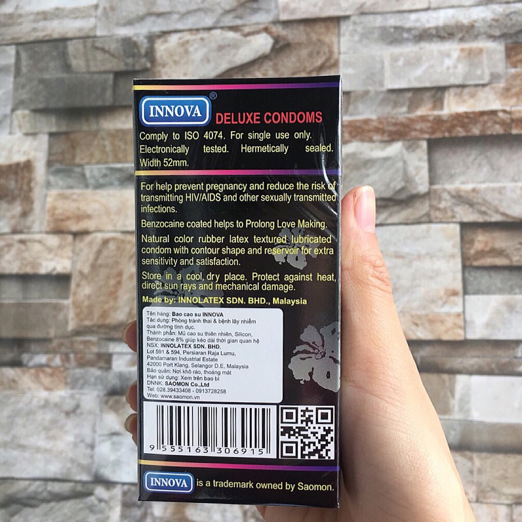 SẢN PHẨM ĐÓNG GÓI ĐƯỢC CHE TÊN KHI GIAO HÀNG - BẢO MẬT TUYỆT ĐỐI THÔNG TIN KHÁCH HÀNG. COMBO Siêu Ưu Đãi 2 Hộp 24 Chiếc Bao cao su INNOVA Long Shock Gai Đen chính là bí mật để giúp chiếc bao màu đen thần thánh này có thể giúp nam giới hạn chế xuất tinh sớm, để duy trì lửa yêu trong suốt những năm tháng hạnh phúc.Bao Cao Su Innova Đen (Black) còn được thiết kế các phần gai lớn, bi lớn dọc thân bao càng khiến cho việc kích thích được dâng cao tột độ, chị em sẽ vô cùng thú vị, khoái cảm dồn dập, đê mê, ngất ngây và khó có thể có cảm giác lên đỉnh tuyệt vời đến như vậy nếu bạn dùng một chiếc bao cao su bình thường.