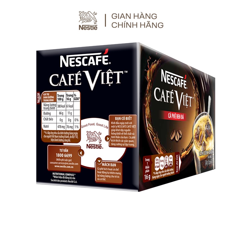 Bao bì giao ngẫu nhiên theo từng đơt nhập hàng THÔNG TIN CHI TIẾT: 1. Cà phê hòa tan Nescafé café Việt đen đá (Hộp 15 gói x 16g) Nescafé café Việt cà phê đen đá có hương vị cà phê đen đậm đà và mạnh mẽ với hương thơm lôi cuốn, cho bạn thỏa mãn niềm đam mê thưởng thức cà phê đen đá thuần túy Việt Nam.