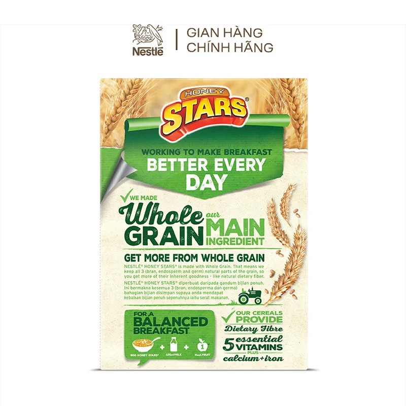 THÔNG TIN CHI TIẾT: 1. Ngũ cốc ăn sáng Honey Stars (Hộp 150g) Ngũ cốc ăn sáng Nestlé® Honey Stars vị mật ong hình ngôi sao, là sản phẩm ngũ cốc ăn liền, dùng kèm với sữa cho bữa sáng giàu dinh dưỡng với thành phần chủ yếu từ ngũ cốc nguyên cám cung cấp 5 vitamin nhóm B, canxi, chất xơ và chất sắt. Mỗi khẩu phần ngũ cốc Nestlé®Honey Stars cung cấp 22% nhu cầu ngũ cốc nguyên cám khuyến nghị hàng ngày. Dùng 1 khẩu phần ngũ cốc Nestlé® Honey Stars với 125ml sữa tươi và 1 trái cây như táo đem lại bữa sáng tiện lợi, giàu dinh dưỡng. Theo nghiên cứu, chỉ có 1 trên 10 trẻ em đang có chế độ dinh dưỡng đủ nguyên cám hàng ngày* (theo nghiên cứu của Hiệp Hội Dinh dưỡng Malaysia trên 5,165 trẻ em tiểu học và 2,947 trẻ em trung học cơ sở). Chế độ ăn đầy đủ dinh dưỡng từ nguyên cám với 2-3 khẩu phần mỗi ngày sẽ giúp bổ sung năng lượng cho bé hăng say học tốt mỗi ngày.