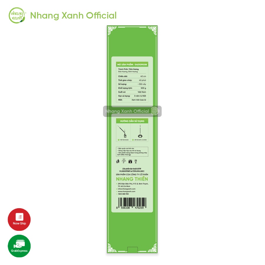 MÔ TẢ SẢN PHẨM Nhang Xanh Phổ Thông 40cm 500g là dòng sản phẩm nhang sạch phục vụ cho nhu cầu thờ cúng tâm linh, được chế tác từ 100% trầm nguyên chất. Khi đốt, hương thơm lan tỏa đậm đà, thanh quý, tạo ấm áp, trang nghiêm cho không gian thờ cúng, tâm linh, là nén hương sạch trân quý thành kính dâng lên Phật và Gia tiên. Nguyên liệu: 100% trầm hương Chiều cao: 40cm Trọng lượng: 500g (~350 cây) Thời gian cháy: 45-50 phút Hạn sử dụng: 3 năm kể từ ngày sản xuất Ngày sản xuất: In trên bao bì Công dụng: Đẩy lùi các khí âm, tạp khí theo quan niệm phong thuỷ, mang lại năng lượng dương, kích thích tài lộc. Hương trầm thanh nhẹ lan tỏa trong không gian, khói hương mỏng, không quá nồng hay gây dị ứng cho mũi. Xua tan các mùi khó chịu sẵn có, đẩy lùi các khí âm, tạp khí và lưu giữ hương thơm dịu nhẹ trong không gian xung quanh. Giúp thu hút năng lượng dương, tạo điều kiện cho tài khí, vận khí có thể bước chân đến gia đình. Lưu ý: Không thắp quá nhiều hương trong không gian kín. Hướng dẫn sử dụng: Thắp nén nhang Cắm vào bát/ lư hương Bảo Quản: Bảo quản nơi khô ráo Đóng nắp hộp sau khi sử dụng Sản phẩm dùng được trong phòng máy lạnh (điều hòa) Xuất xứ: Việt Nam ✔ CAM KẾT Không bán hàng giả, hàng nhái. Hoàn tiền 100% nếu hàng không chính hãng Không bán hàng kém chất lượng. Chính sách đổi trả, hoàn tiền nếu hàng lỗi do nhà sản xuất ✔ ĐẢM BẢO 3 KHÔNG - Không hóa chất: không màu nhuộm chân nhang, không chất giúp cuốn tàn, chất cháy (giúp bắt lửa nhanh) - Không hương liệu tạo mùi hương - Không độc hại ✔ NHANG XANH - CHO NHỮNG KHỞI SỰ AN LÀNH Website: NhangXanh.com Fanpage: NhangXanh.com Hotline: 1800 888 980 Cửa hàng 1: 290 Điện Biên Phủ, P. 17, Q. Bình Thạnh, TP. Hồ Chí Minh Cửa hàng 2: 23 Hoa Huệ, P. 07, Q. Phú Nhuận, TP. Hồ Chí Minh