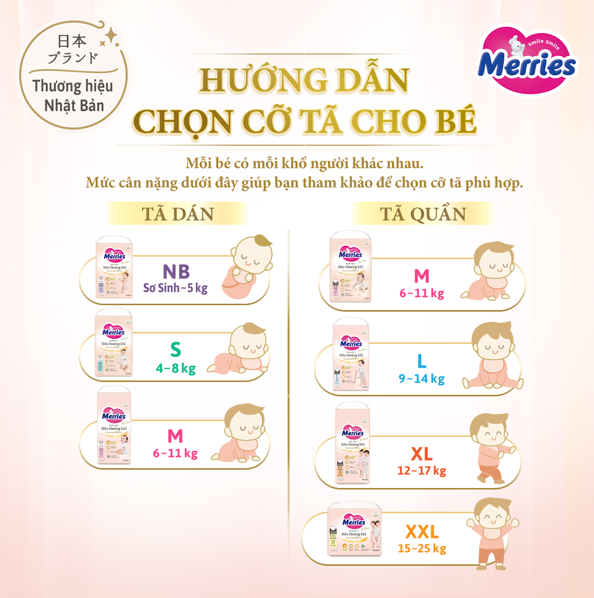 Ra đời vào năm 1983, Merries là thương hiệu tã giấy cao cấp của tập đoàn KAO, Nhật Bản. Sản phẩm luôn là sự tin dùng của các bà mẹ tại Nhật và nhiều quốc gia. Với phương châm mang đến những sản phẩm có giá trị, vì sự hài lòng của người tiêu dùng, Merries luôn không ngừng nỗ lực phát triển các sản phẩm tã bỉm cao cấp, phù hợp với làn da mỏng manh của bé. Các loại tã của Merries đem đến sự thông thoáng, mềm mại tuyệt vời giúp bé linh hoạt trong mọi chuyển động, tự do vui đùa. Với công nghệ ""4 siêu"" - siêu mềm mại, siêu thông thoáng, siêu thấm hút, siêu linh hoạt, tã dán Merries trở thành ""người bạn"" của hàng ngàn em bé trên toàn thế giới.