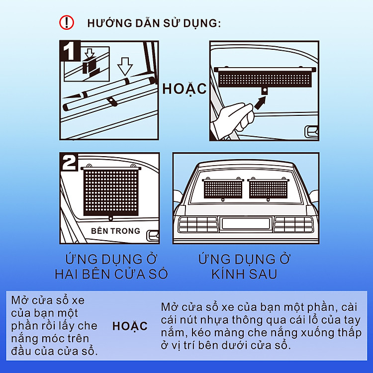 - Hướng dẫn sử dụng: Mở cửa sổ xe một phần. Lấy móc che nắng móc lên đầu cửa sổ. Mỗi lần sử dụng chỉ cần kéo bảng che xuống.