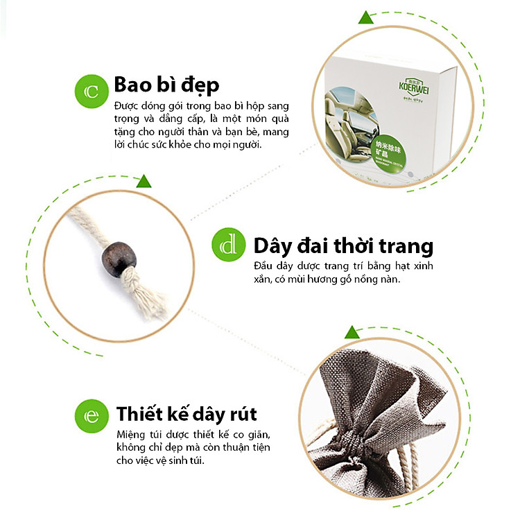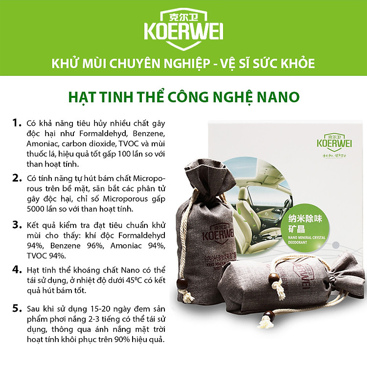 Hạt tinh thể nano khử mùi KOERWEI 250g*2 đến từ thương hiệu uy tín hàng đầu sở hữu thiết kế nhỏ gọn, tinh tế, có khả năng khử và tiêu hủy nhiều chất gây độc hại đặc biệt sau khi sử dụng 15-20 ngày đem sản phẩm phơi nắng 2-3 tiếng có thể tái sử dụng, thông qua ánh nắng mặt trời hoạt tính khôi phục trên 90% hiệu quả.