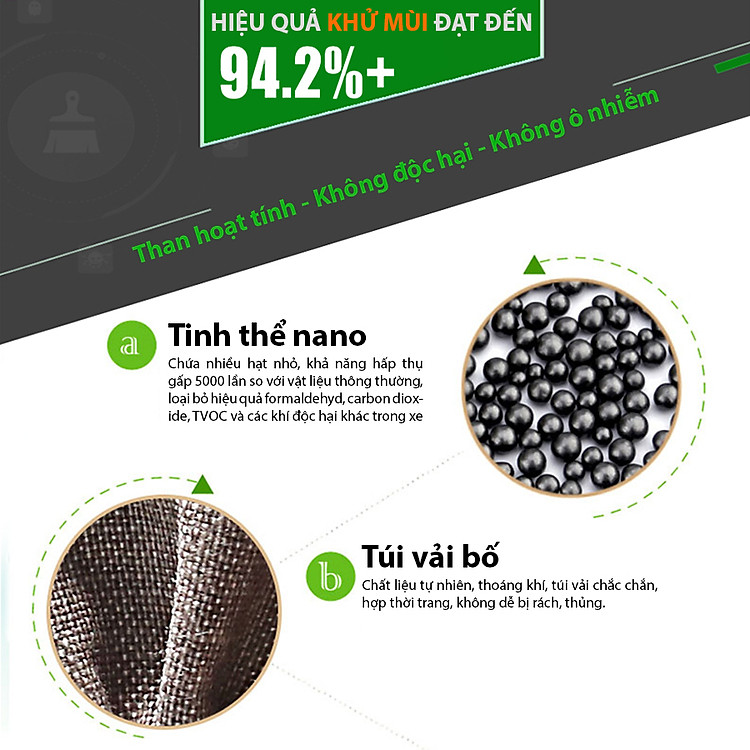 | Hướng dẫn sử dụng | Tháo gỡ bao ny long bên ngoài, có thể trực tiếp để trong xe, trong tủ lạnh, tủ áo, tủ giày, khi không gian quá lớn thì phải tăng dung lượng hạt nano thích hợp |