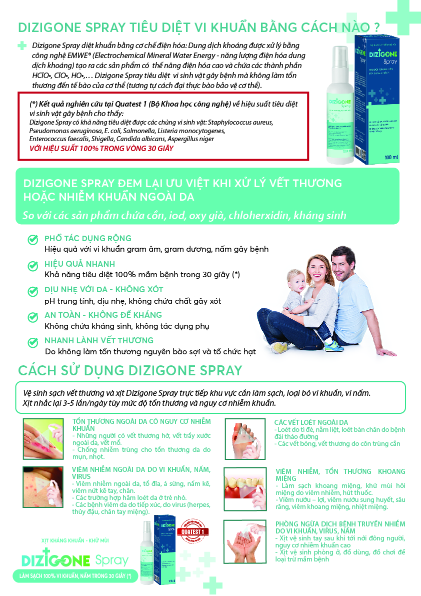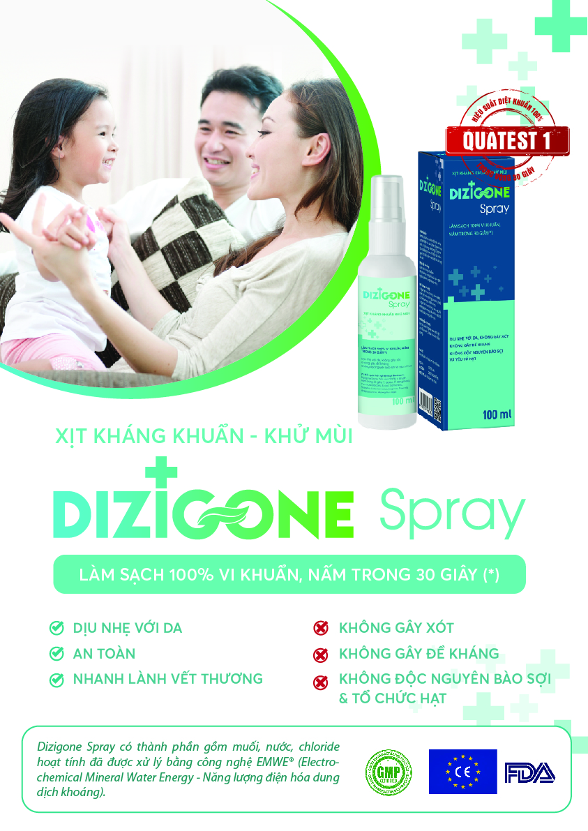 Xịt kháng khuẩn Dizigone Spray là dung dịch kháng khuẩn áp dụng công nghệ "xanh" EMWE từ châu Âu, diệt khuẩn bằng cơ chế điện hóa, giúp tiêu diệt mầm bệnh, sát khuẩn nhanh chóng chỉ trong 30 giây, đồng thời rất dịu nhẹ, không gây xót, nhanh lành vết thương, hạn chế tạo sẹo.