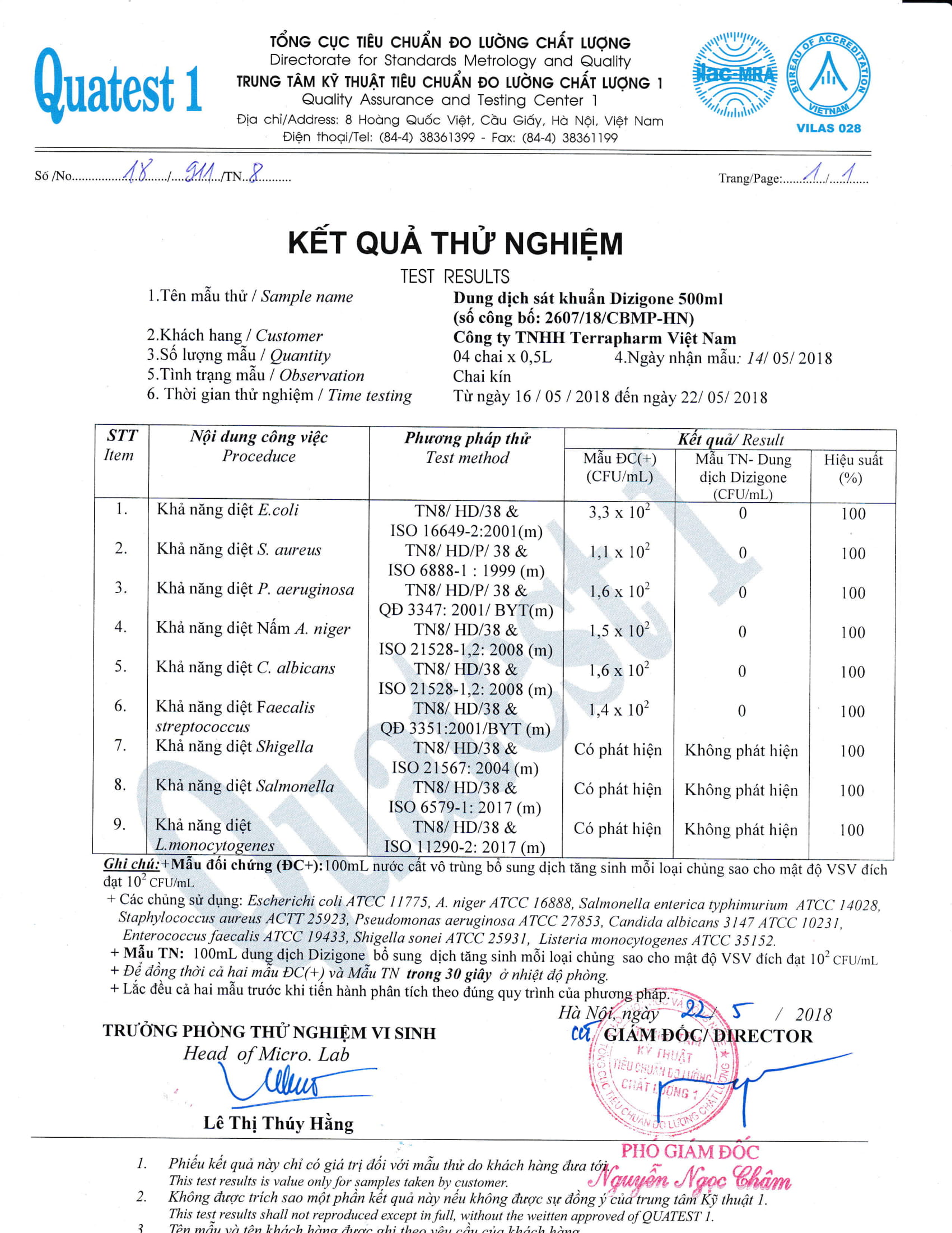 Dizigone làm sạch 100% mầm bệnh trong vòng 30 giây