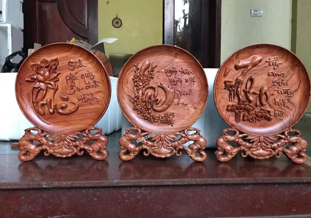 _ Đĩa được chạm khắc vô cùng tỉ mỉ ,tinh sảo kỳ công .Đi hầu hết tất cả mọi chi tiết góc ngách nội dung hoa văn của tượng đều được gọt tỉa chỉnh sửa sắc nét hoàn toàn bằng tay thủ công .Đồng thời đĩa được kiểm định kỹ lưỡng khắt khe ,như cho vào thẩm sấy cho gỗ khô kiệt .Mục đích trống dập nứt vênh mo mối mọt .Kết hợp với trà nhám đánh giấy giáp nhiều nước sờ mát lạnh .Song cho vào phun lót làm bóng mờ để giữ lại mầu sắc vân gỗ tự nhiên .Đẹp long lanh như ảnh trên .Đĩa được làm và hoàn thiện do bàn tay khối óc tài hoa .Từ những người thợ giàu kinh nghiệm ,trong làng nghề truyền thống .