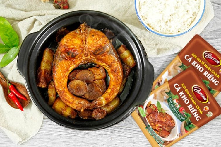 Xốt Gia Vị Hoàn Chỉnh Barona Cá Kho Riềng sẽ ngon hơn khi kho trong nồi đất (tộ) và dùng nguyên liệu cá trắm/ cá mè, có thể thêm ít nghệ tươi.