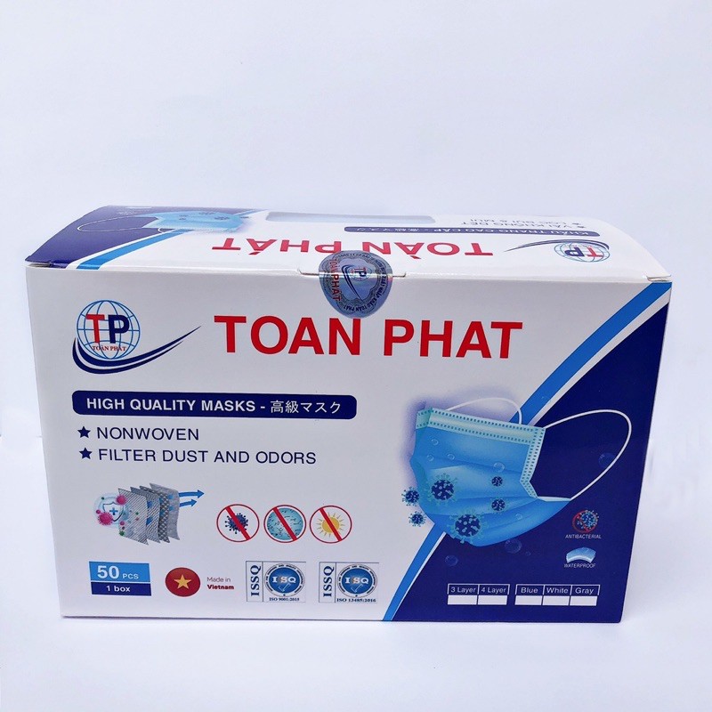 Khẩu trang y tế Toàn Phát đã qua tiệt trùng, có tác dụng ngăn khói bụi, vi khuẩn xâm nhập, phòng chống các dịch bệnh nguy hiểm lây qua đường hô hấp. Sản phẩm sử dụng hiệu quả khi lưu thông trên đường, làm việc trong bệnh viện và môi trường công nghiệp độc hại. - Lớp vải không dệt lọc không khí không thấm nước, thoáng khí, mịn màng, không gây dị ứng da - Thanh tựa mũi định hình, giúp cố định khẩu trang và tạo độ kín, ôm trọn khuôn mặt - Dây đeo chắc chắn, độ co dãn tốt tạo cảm giác thoải mái khi sử dụng - Sản xuất theo tiêu chuẩn