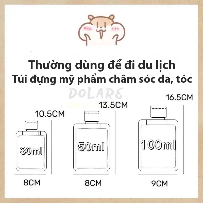 Có 3 kích thước khác nhau: 30 ml, 50 ml, 100 ml phù hợp cho nhiều nhu cầu sử dụng và thời gian chuyến đi.