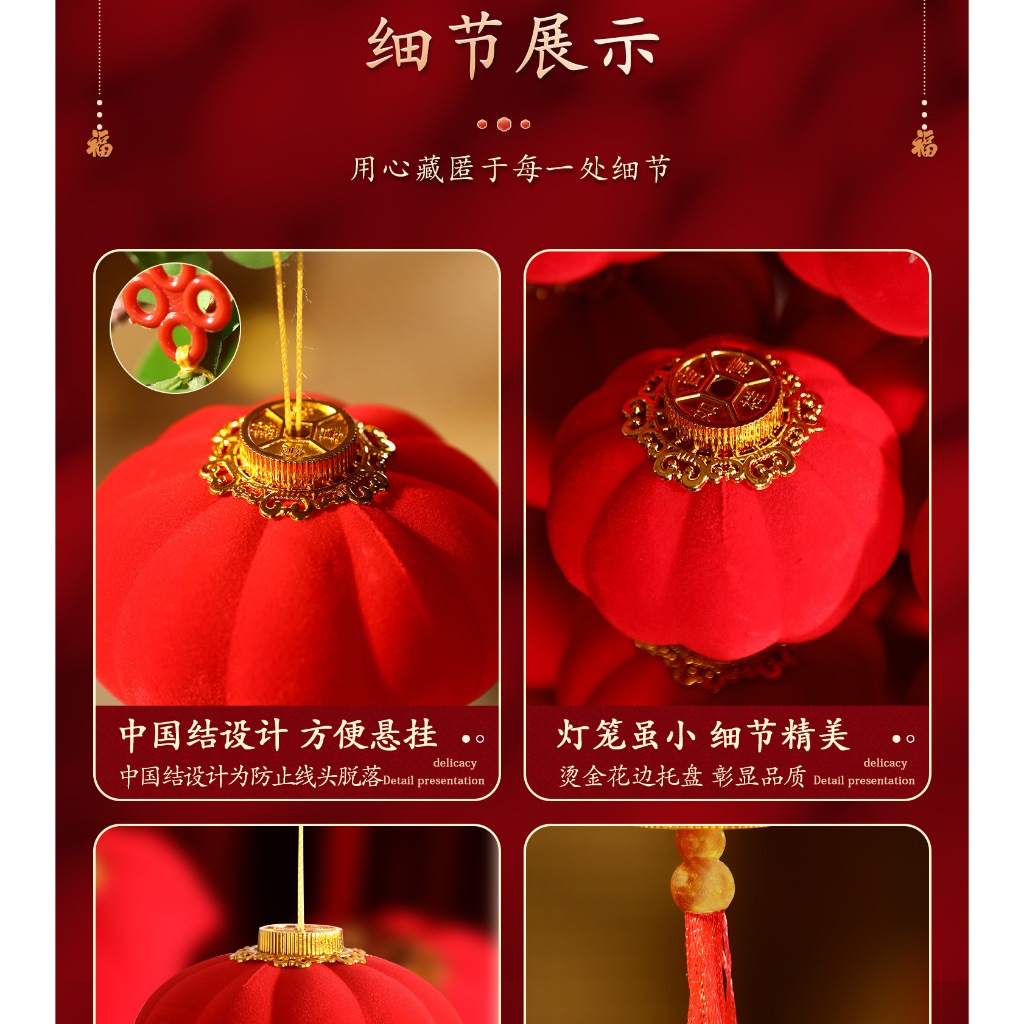 Bộ đèn lồng đỏ mini dùng để trang trí cây mai, cây đào hoặc không gian ngày Tết, tạo vẻ ấm áp và may mắn. Thiết kế nhỏ gọn, dễ treo và bền màu.