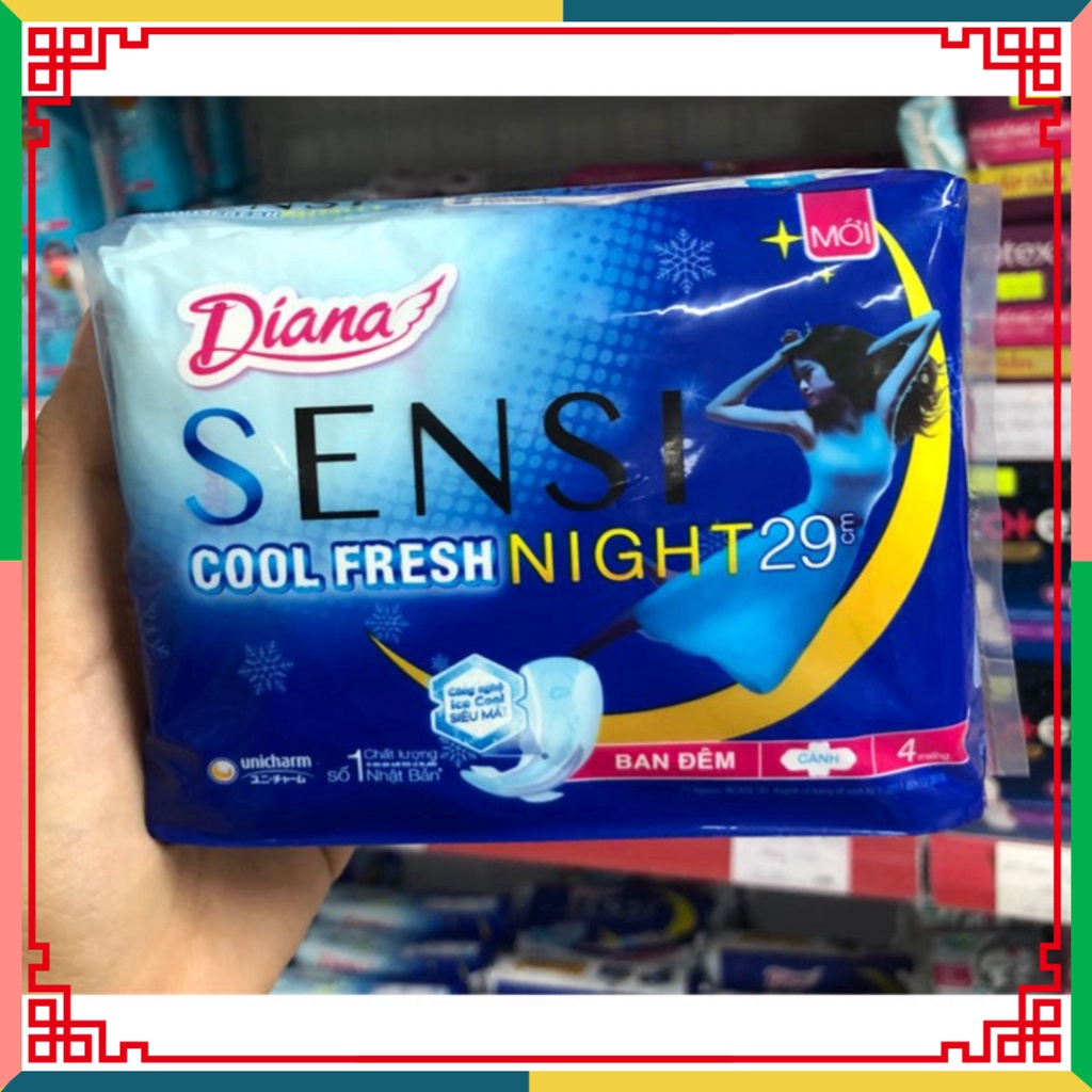Bách hoá Ngọc Toản 0815577333 Khi hết gói 4 miếng Shop sẽ thế loại gói 2 miếng cùng loại,khách hàng chú ý dùm shop. Băng Vệ Sinh Diana Sensi Night 29Cm( super night 29cm) sở hữu lõi thấm kép dựa trên công nghệ nghiên cứu của các chuyên gia Nhật Bản kết hợp với rãnh chống tràn 2 bên và phía sau sẽ giúp bảo vệ toàn diện cho bạn trong những ngày "đèn đỏ".